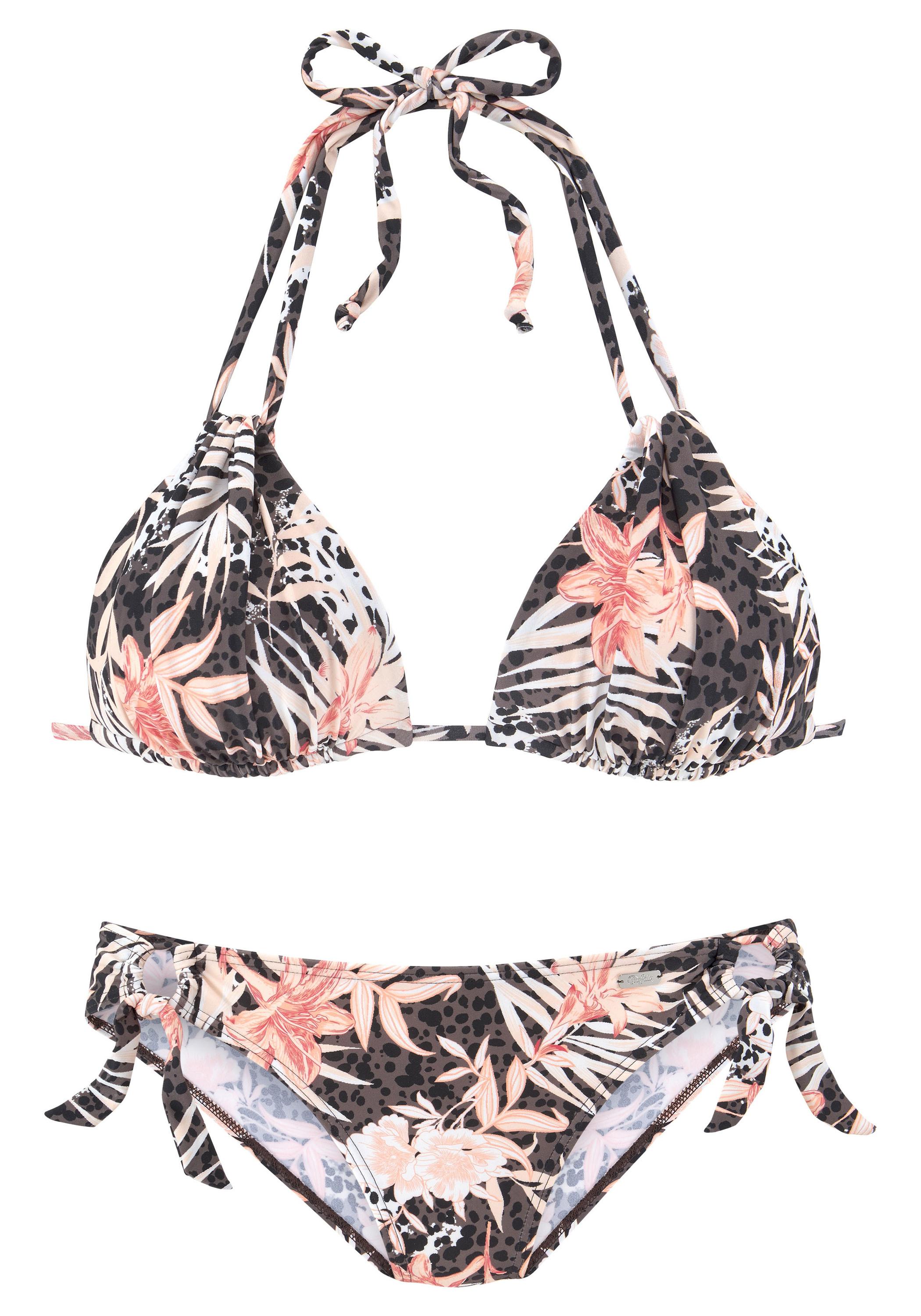 Triangelbikini von Buffalo. Mit Alloverprint. Jedes Teil ein Unikat. Wattierte Cups. Doppelte Neckholderträger. Im Rücken zu binden. Hose mit seitlichen Bindedetails. Trageangenehme Qualität. Mit recyceltem Polyamid.