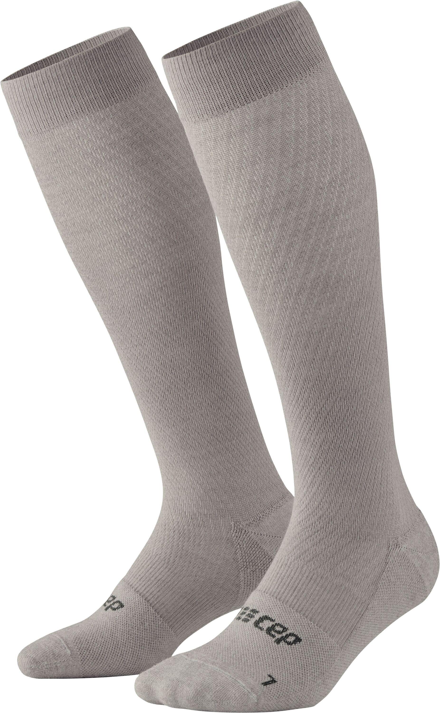 Die Flight Socks in Tall von CEP stimulieren dank ihrer hoch geschnittenen Kompressionspassform die Blutzirkulation in den Beinen. Das senkt das Reisethromboserisiko. Merinowolle stellt zusätzlich ein angenehmes Fußklima sicher und wirkt antibakteriell. Die atmungsaktiven Fasern leiten die Feuchtigkeit außerdem weg von der Haut.