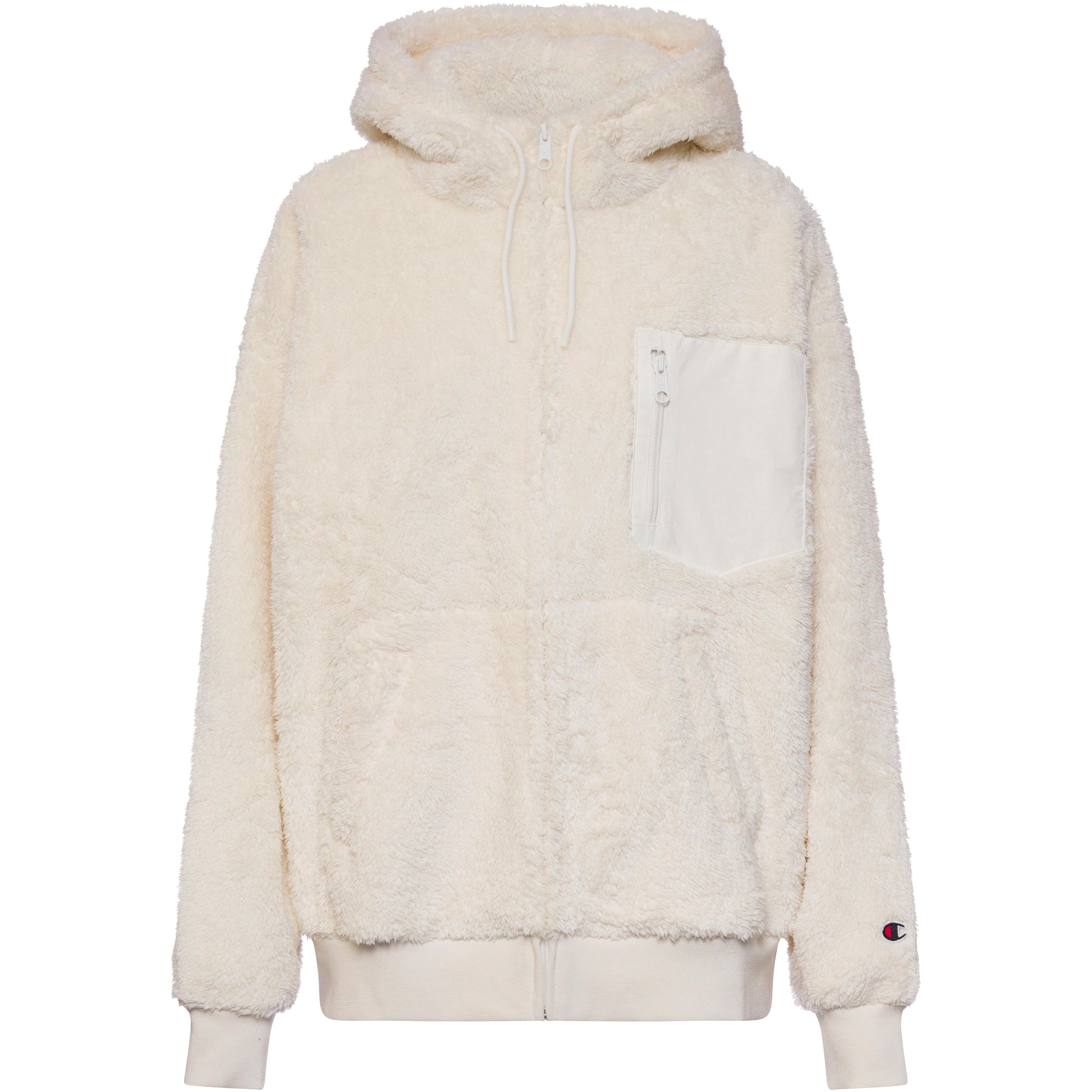 Kuschelige Fleecejacke in weiter Loose Fit Passform; verstellbare Kapuze mit integriertem Kordelzug; 1 aufgesetzte Brusttasche mit Reißverschluss; seitliche Eingriffstaschen; Markendetails; wir empfehlen die nächst kleinere Größe; Material I 60% Polyester, 40% Baumwolle, Material II 100% Polyamid, Material III 100% Baumwolle, Material IV 98% Baumwolle, 2% Elastan.