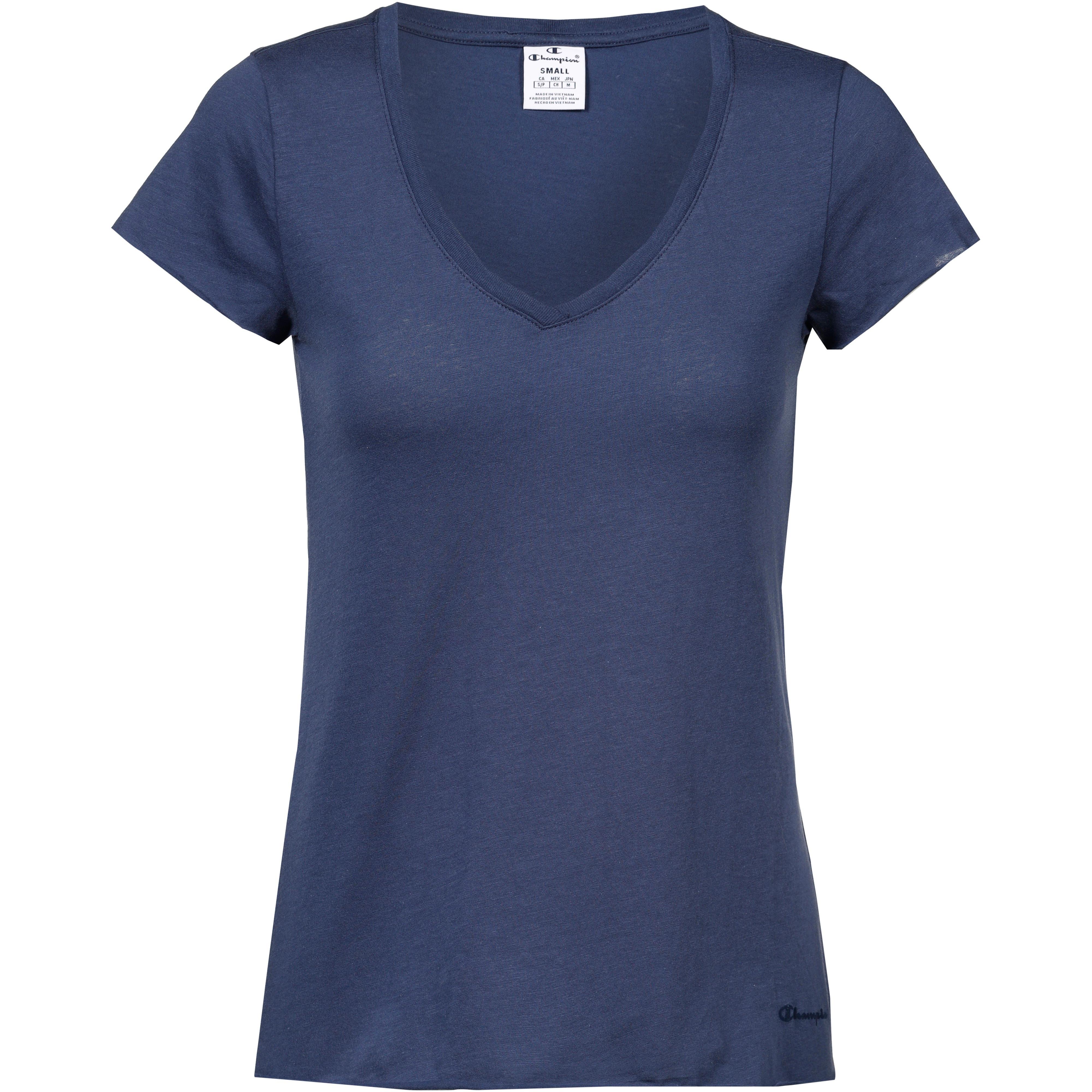 Leichtes T-Shirt mit V-Ausschnitt; Labelprint; offene Rollsaum-Kanten an den Abschlüssen; weiches Nackenband; normale Passform; Material 100% Baumwolle.