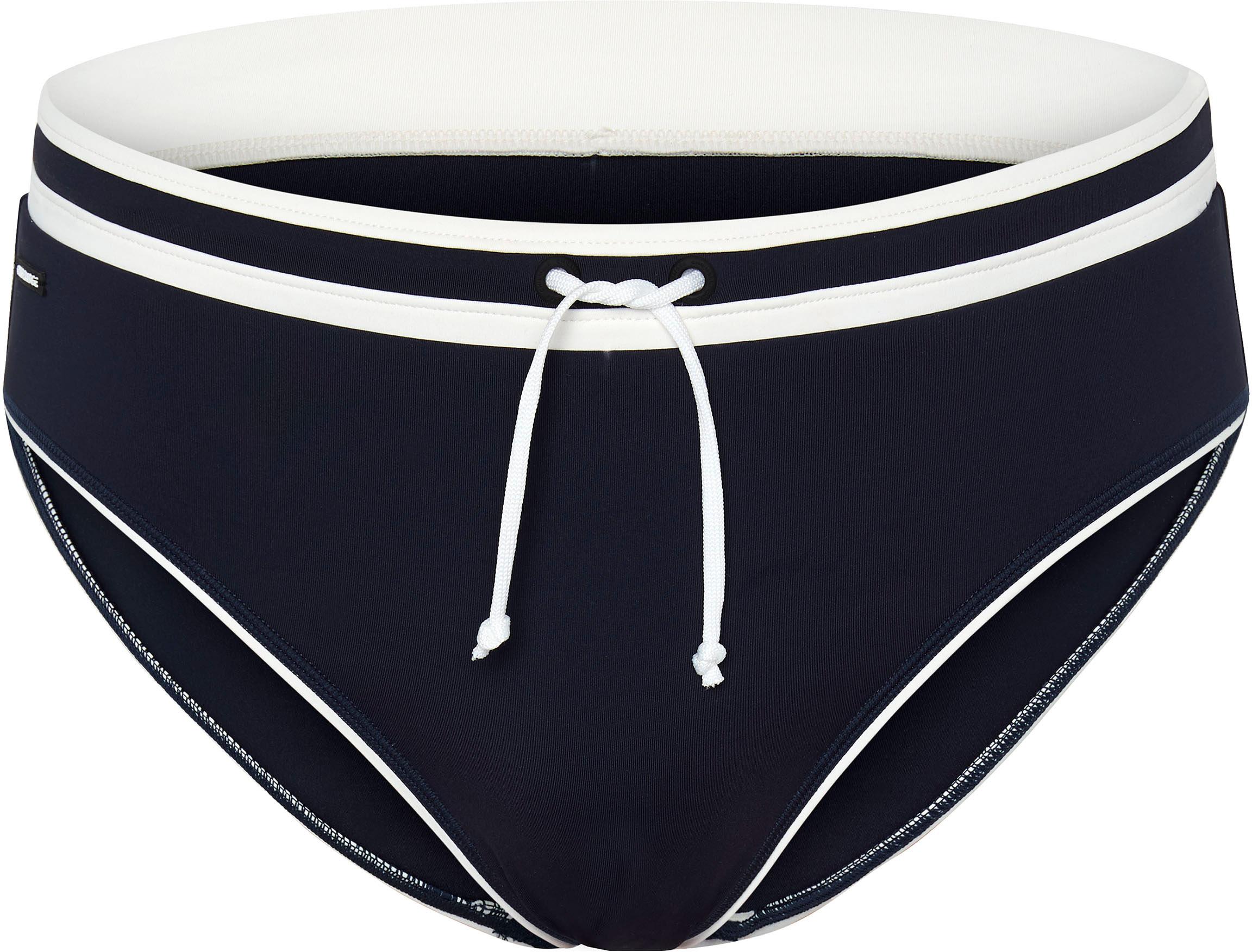 Enganliegende Badehose in Slip-Form; elastisches Material; breiter Bund mit Kordelzug für die ideale Passform; Kontraststreifen am Bund; Vorderseite gefüttert; Material 78% Polyamid, 22% Elastan.