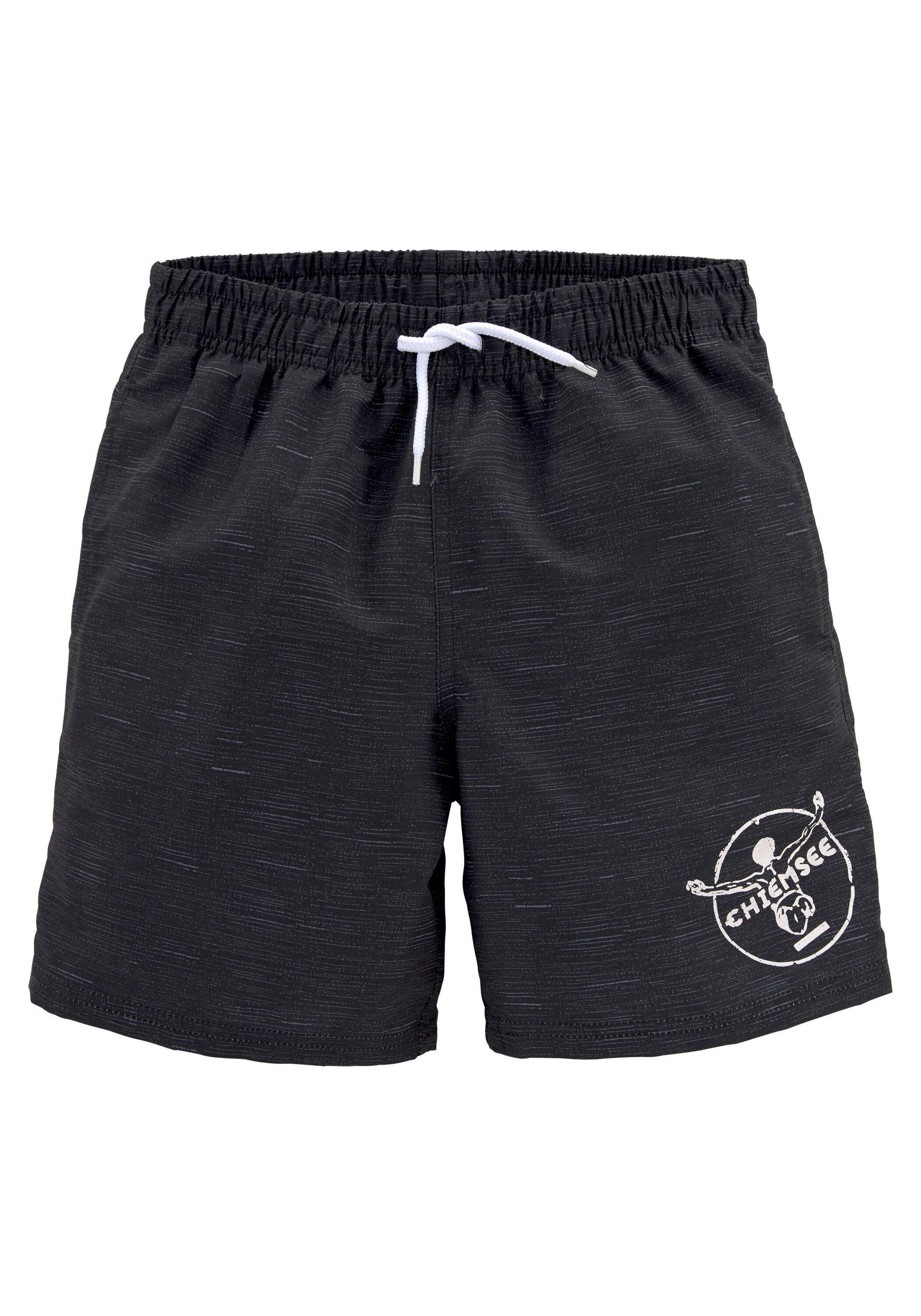 Badeshorts von Chiemsee in Melange-Optik und Marken-Aufdruck. Elastischer Bund mit Außenkordel und seitlichen Eingrifftaschen. Obermaterial aus 100% Polyester. Innenslip aus 100% Polyester.