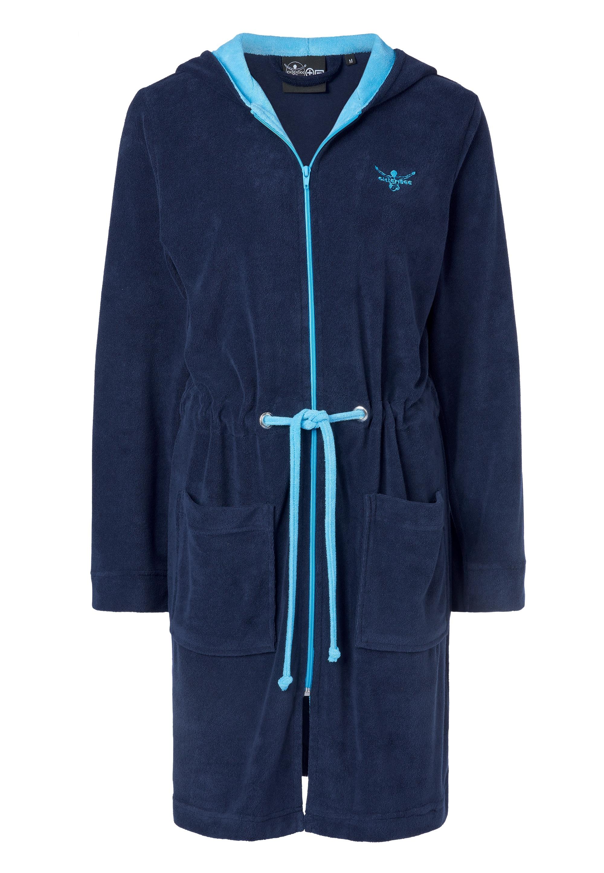 Volle Punktzahl. Der Leichtfrottier-Bademantel aus der Chiemsee Home Kollektion erhält von uns eine 10 von 10. Er ist nicht nur aus einem leichten Frottier gefertigt, dass sich einfach nur großartig auf deiner Haut anfühlt, sondern auch optisch ein Hingucker. Sattes Marineblau und gezielte Kontraste an Kapuze, Logo und Bindeschlaufe in einem strahlenden Hellblau setzen das gute Stück gekonnt in Szene. Cancun ist extrem bequem und sorgt für ein rundum gutes Gefühl - zu Hause, am Strand und vor allem in der Sauna. Hier haben wir ihn nämlich für dich getestet. Ergebnis: Schön leicht, megabequem und definitiv nicht zu warm! Mit Cancun machst du auch im Saunarestaurant eine gute Figur. Er ist saugfähig, schnelltrocknend und platzsparend zugleich. Ein nachhaltiger, unter fairen Bedingungen sorgsam produzierter Artikel, der absolut schadstofffrei ist. Wir wünschen viel Freude beim Relaxen.
