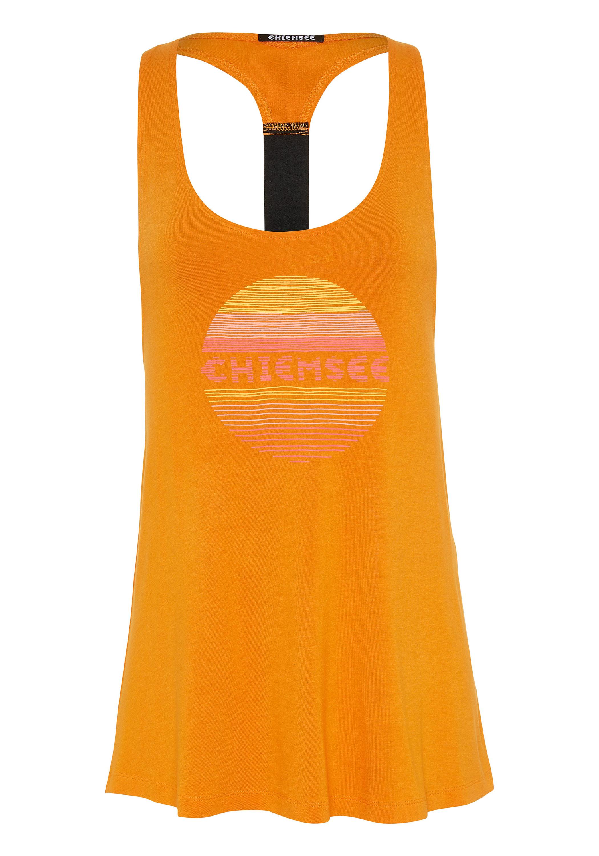 Modernes Warmwetter-Essential für die City und den Beach: Bei dem CHIEMSEE Damen-Top vereint sich ausgestellte Racerback-Silhouette mit Logo-Strap und sommerlichem Frontprint. Das runde Multicolour-Motiv mit Label-Schriftzug erinnert an einen Sonnenuntergang am Meer. Dank der luftigen und elastischen Viskose-Mischung verspricht das CHIEMSEE Top neben einem stylishen Hängerchen-Look auch herrlichen Komfort.
