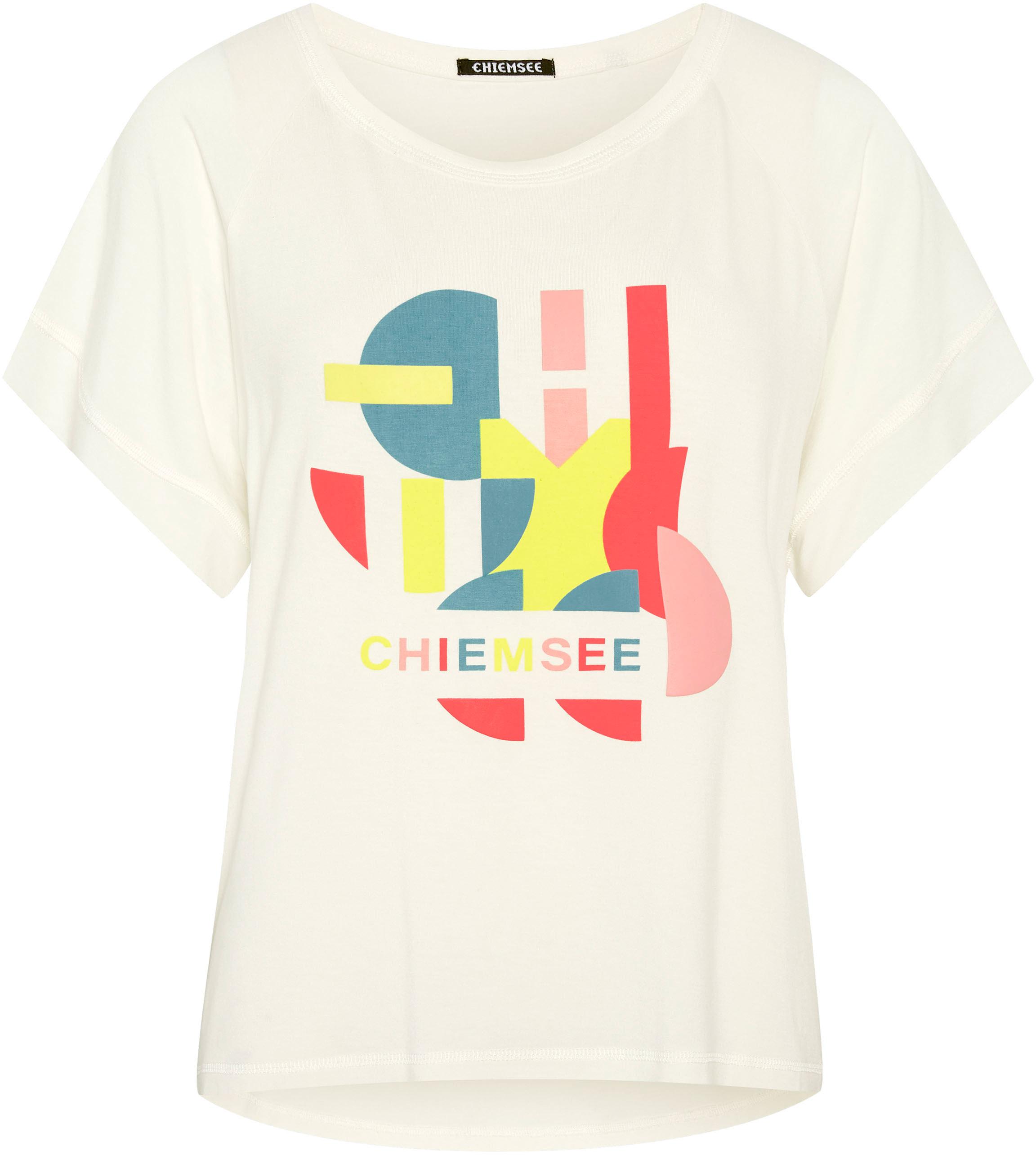 Lässig geschnittenes T-Shirt mit buntem Labelprint auf der Vorderseite; überschnittene Schulter; weite Ärmel; Material 95% Viskose, 5% Elastan.