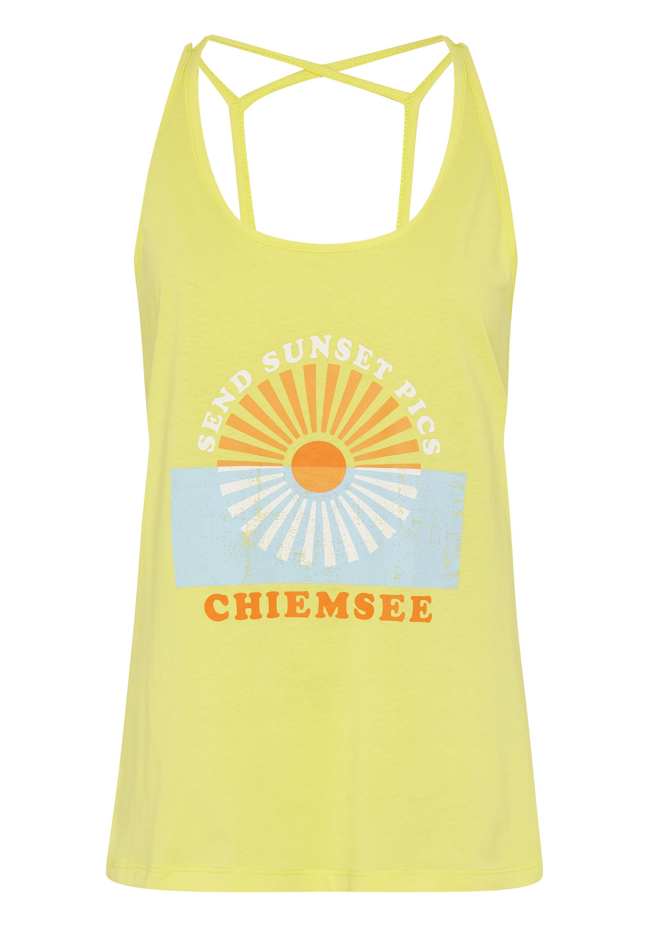 Neu interpretiertes Sommer-Basic: Bei dem CHIEMSEE Top matchen sich Riemchenträger, „SEND SUNSET PICS“-Schriftzug und Sonnenmotiv. Für ein luftiges Tragegefühl sorgen die lockere A-Linie und die angenehm leichte Baumwolle. Ein Warmwetter-Must-have par excellence.