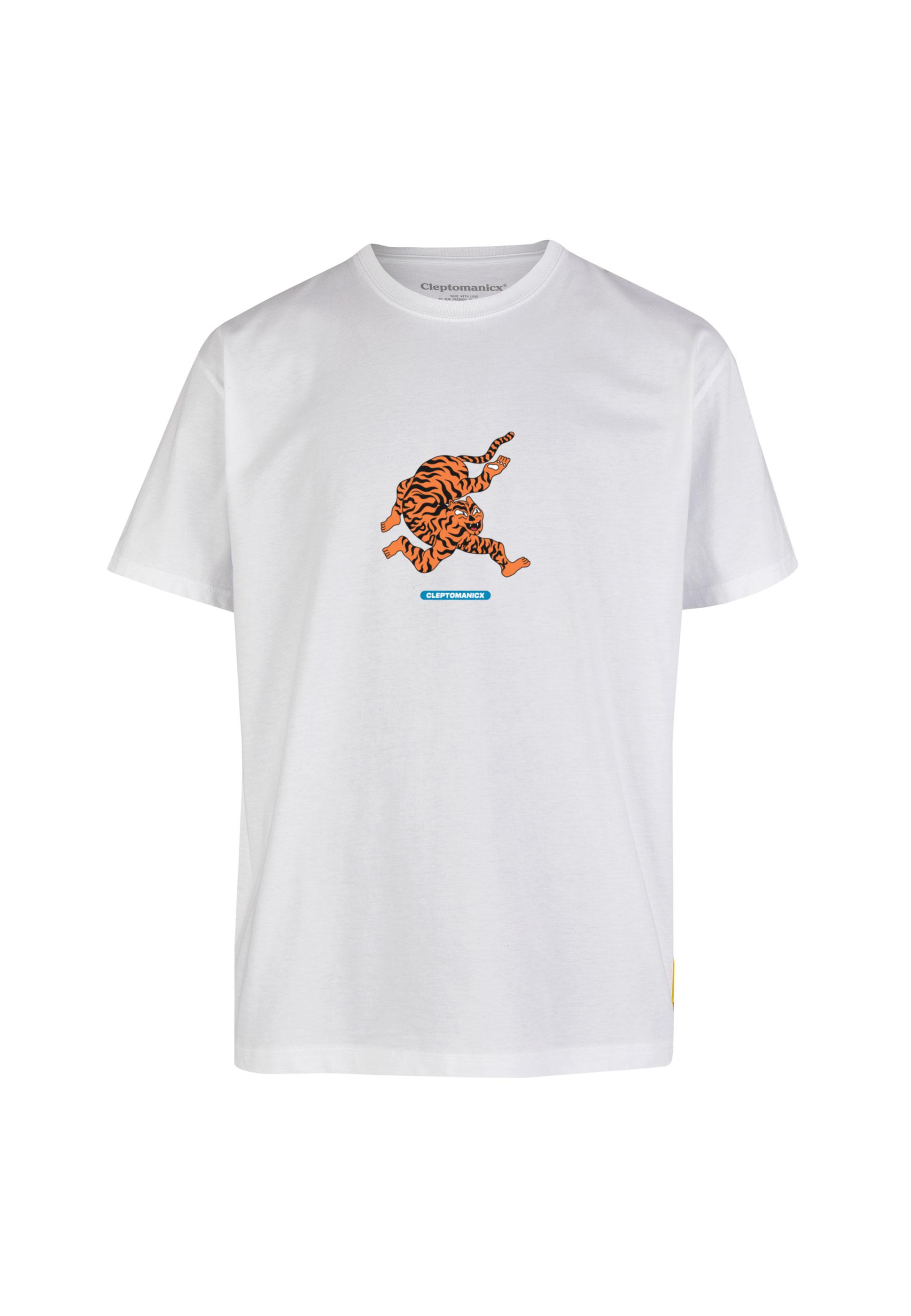 Dieses coole T-Shirt von Cleptomanicx für Herren begeistert mit seinem großen Tiger-Print auf der Front, welcher sofort für einen angesagten Look sorgt. Es kommt im locker-lässigen Boxfit-Schnitt und bietet jederzeit einen super Tragekomfort. Ein klassischer Rundhals-Ausschnitt und die hochwertige Herstellung mit Bio-Baumwolle sind zusätzlich bequem und ergänzen das Modell perfekt.