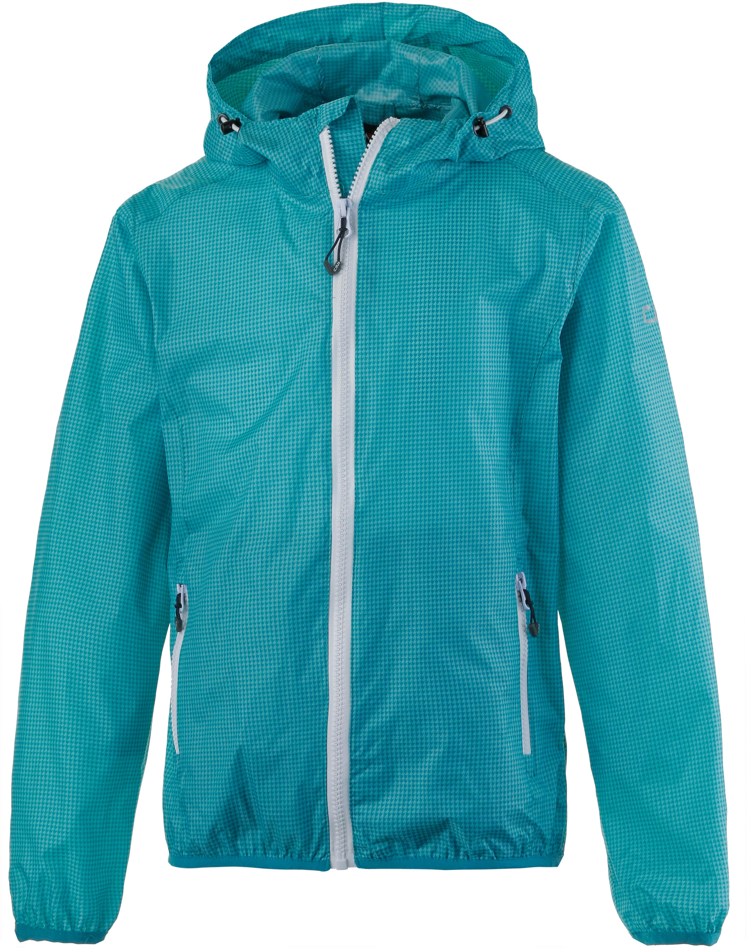 Regenjacke für Mädchen, mit seitlich verstellbarer Kapuze; Frontreißverschluss mit Kinnschutz; Abschlüsse mit Elastikeinfassung; 2 seitliche Eingrifftaschen mit Reißverschluss; 100% Polyamid.