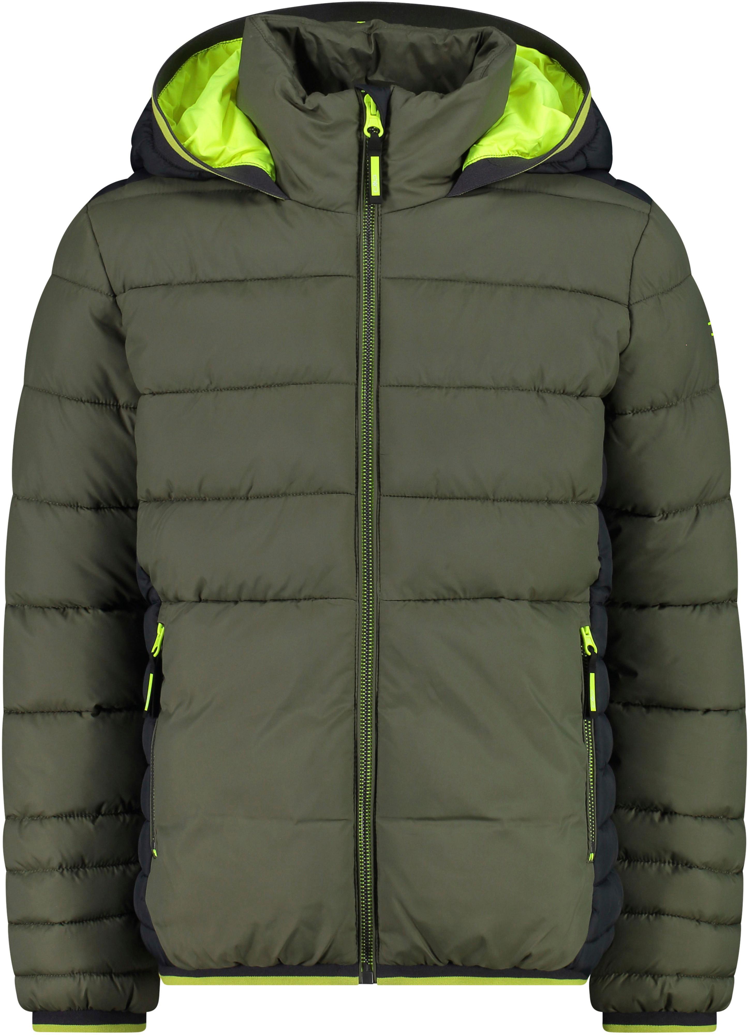 Steppjacke mit fester Kapuze und durchgehendem Frontreißverschluss; 2 Seitentaschen mit Reißverschluss; leichte, wasserabweisende und atmungsaktive Feel Warm Flock-Synthetikisolierung mit hoher Wärmeleistung; kontrastfarbene Details; ohne PFC hergestellte DWR-Beschichtung; Material 100% Polyester.