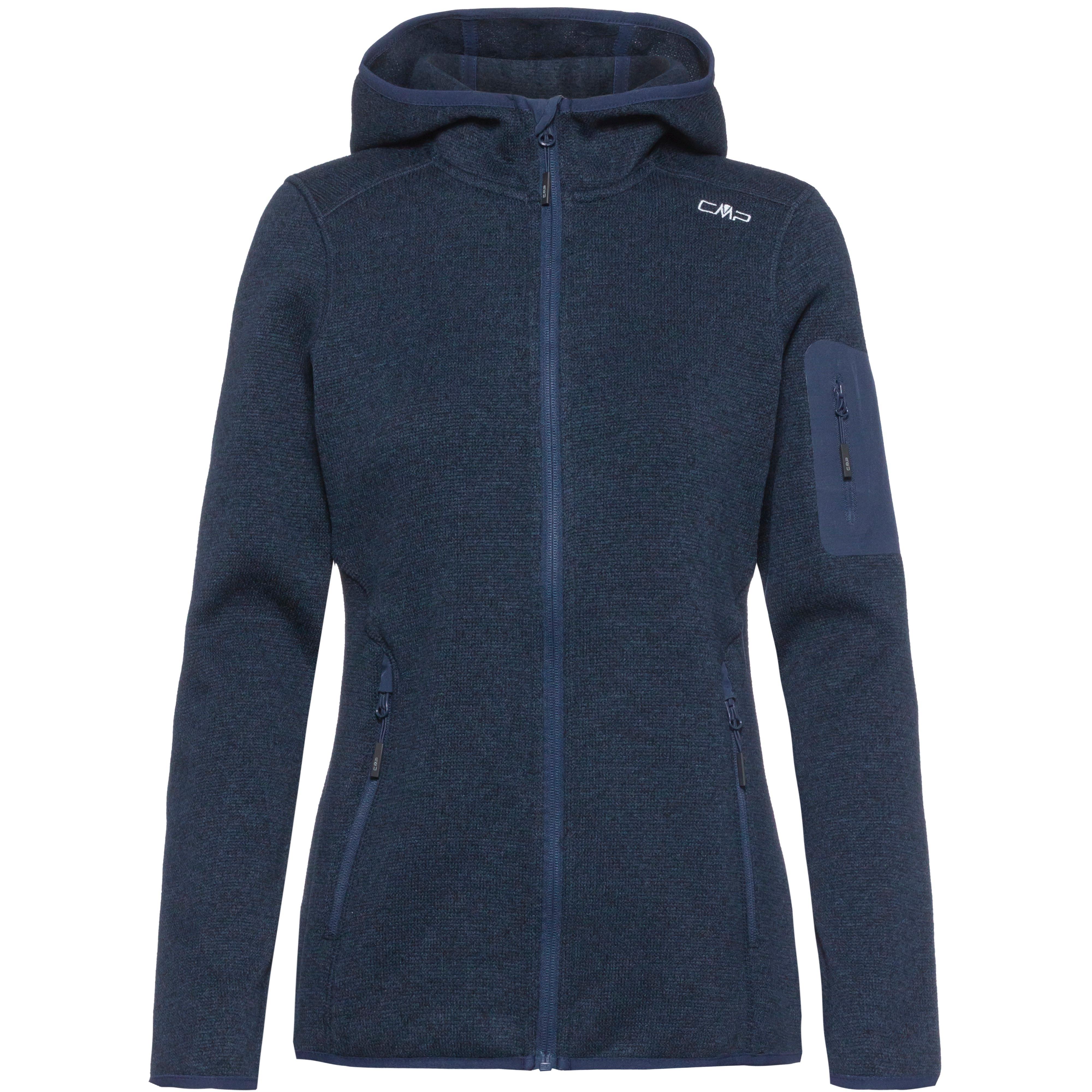 Strickfleecejacke aus wärmendem Light Knit-Tech; Stehkragen mit Nackenband und Kinnschutz; feste Kapuze; unterlegter Frontreißverschluss; 2 meshgefütterte Reißverschlusstaschen mit Zip-Garage; verlängerte Zippbändchen; 1 gebondete Reißverschlusstasche auf dem Ärmel; Abschlüsse mit schmalen Elastikbündchen; Material 100% Polyester.