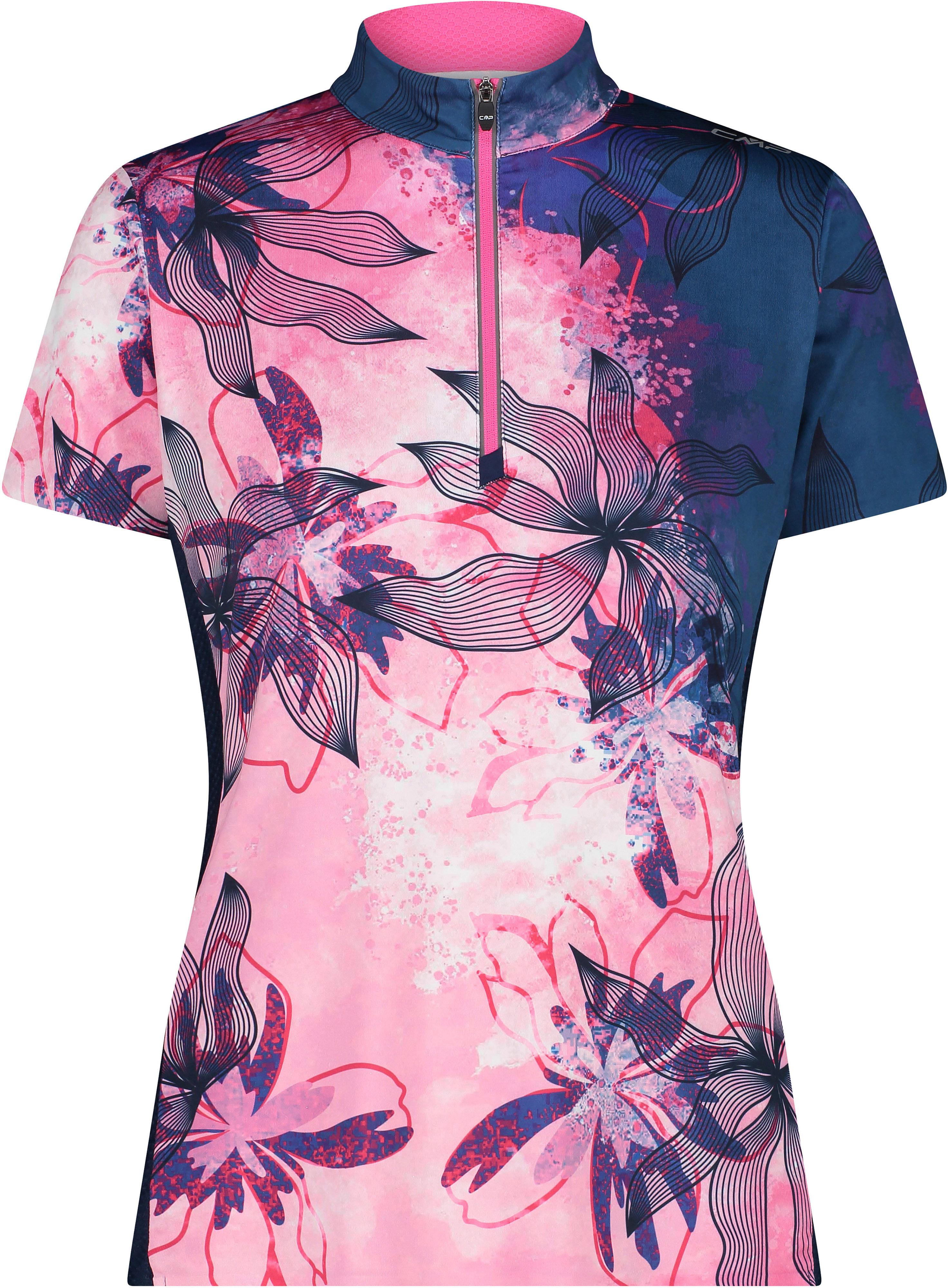 Fahrradtrikot mit floralem Allover-Print; 4-Wege-Stretchgewebe; mit feuchtigkeits- und thermoregulierender Dry Function-Technologie für ein angenehm trockenes Körperklima; mit geruchshemmender Behandlung; Stehkragen; halblanger Reißverschluss auf der Vorderseite; kurze Ärmel; Material I 90% Polyester, 10% Elastan; Material II 98% Polyester, 2% Elastan.