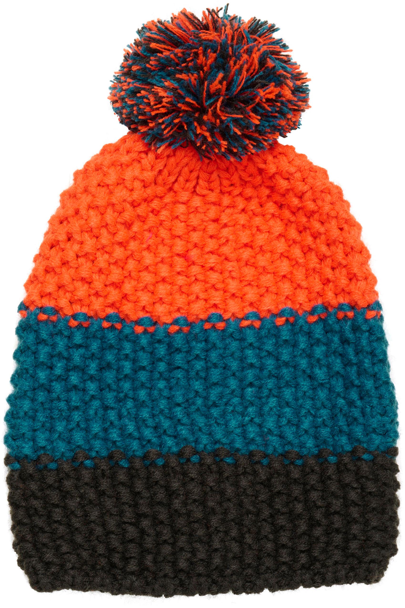 Bommelmütze aus grobem Strickmaterial; bunte Blockstreifen; atmungsaktiv und dehnbar; warm gefüttert; Obermaterial 100% Polyacryl, Futter 100% Polyester.