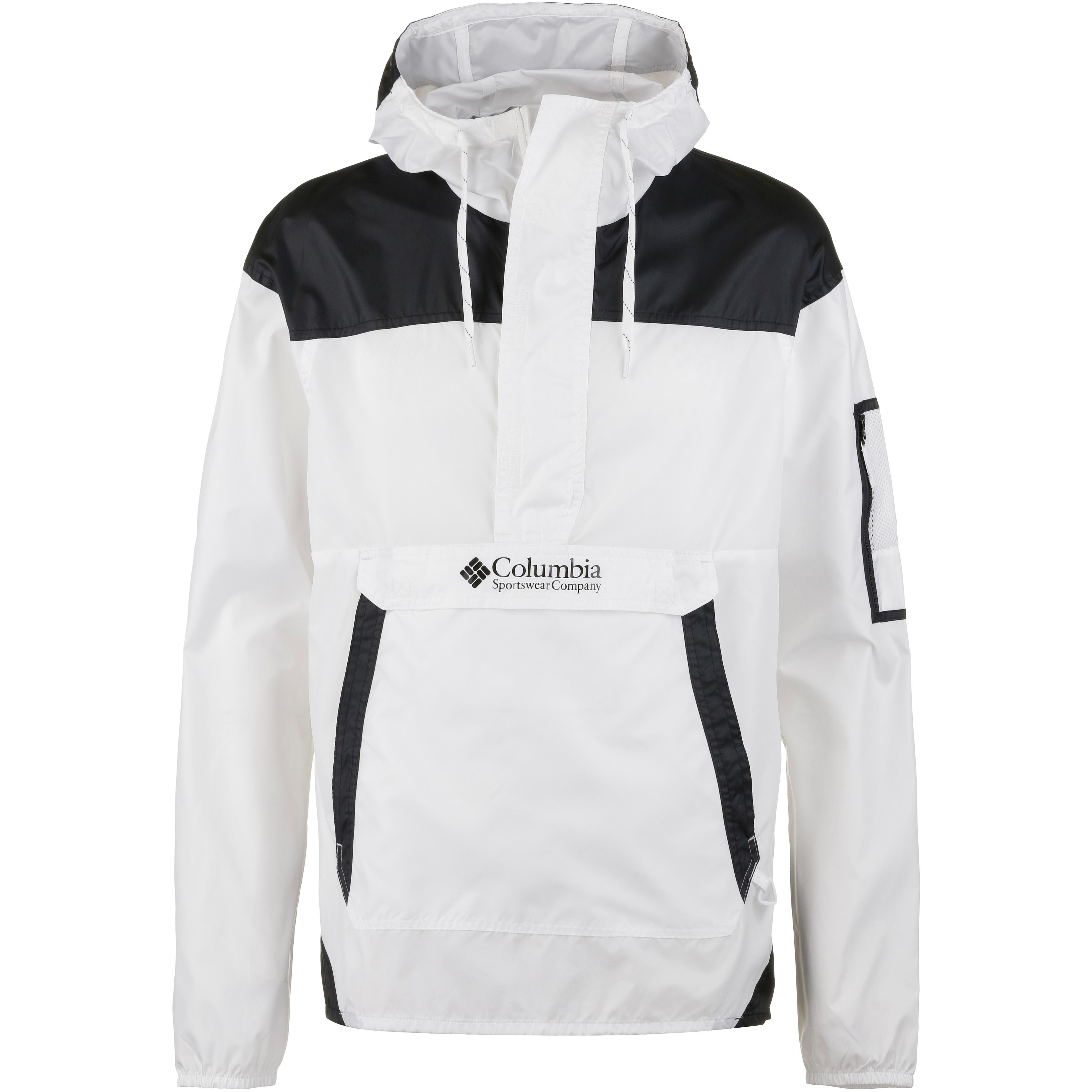 Columbia CHALLENGER. Sehr leichter Windbreaker im Colorblock-Design; durch Kordelzug verstellbare Kapuze; unterlegter Half-Zip; Windblende mit Klettverschluss; 1 große Bauchtasche mit Klettverschluss und 1 Reißverschlussinnenfach; 1 Kängurutasche; 1 Netztasche mit Reißverschluss auf dem Ärmel; elastische Ärmelabschlüsse; Material 100% Polyester.