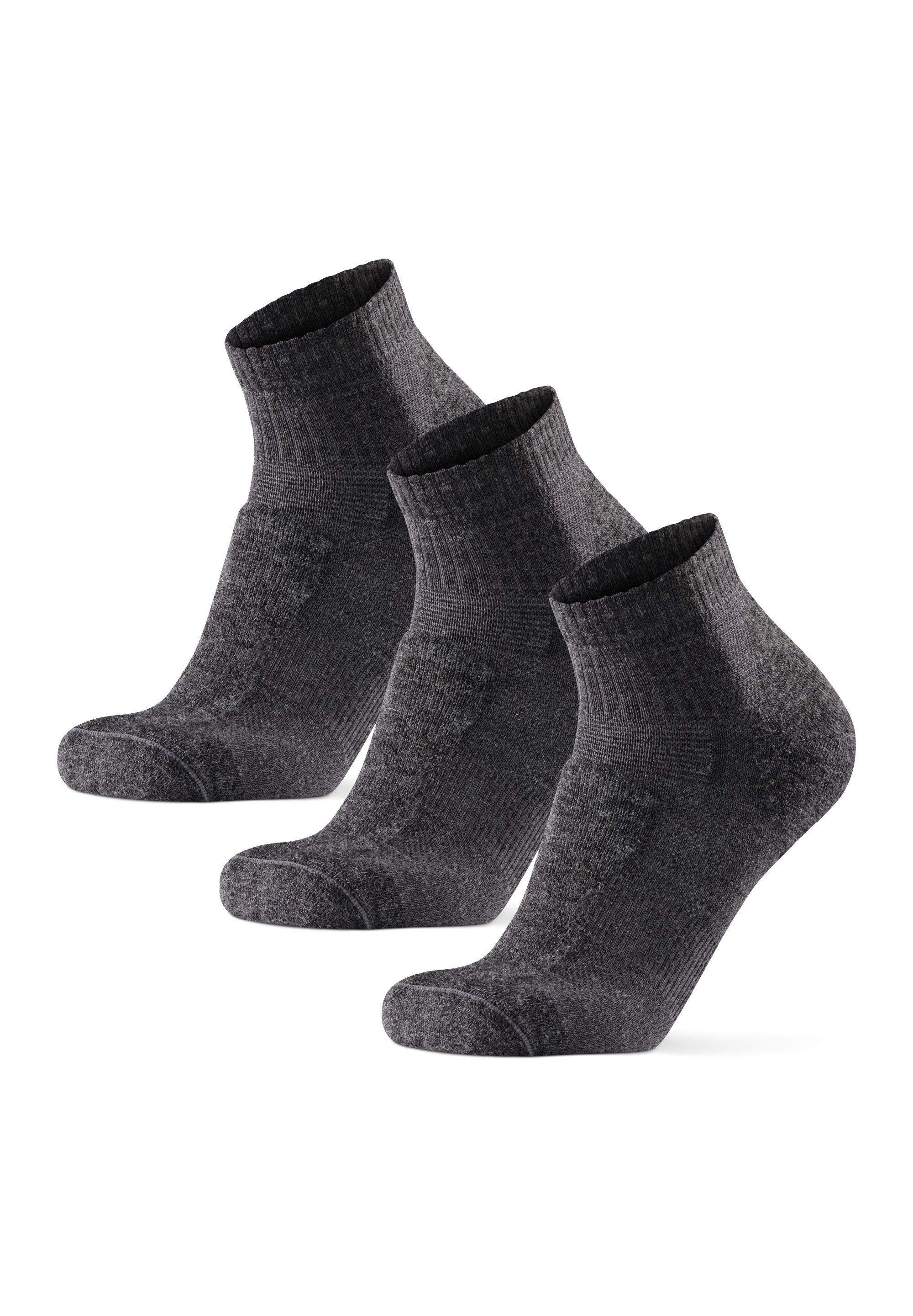Diese leichten, kurzen Merino Wandersocken sind aus temperaturregulierender Wolle. Sie verfügen über eine leichte Polsterung von der Ferse bis zu den Zehen und eine Fußgewölbestütze für zusätzlichen Komfort bei Wanderungen. Mit kühlendem Mesh und Ventilationsbahnen für verbesserte Atmungsaktivität sind diese Wandersocken perfekt für Wanderungen bei warmen Wetter und in leichtem Gelände. Das niedrig geschnittene Design erhöht den Komfort und macht sie besonders geeignet für Sommerwanderungen und hält deine Füße kühl und trocken. Diese Wandersocken Damen und Wandersocken Herren wurden in Zusammenarbeit mit Ausdauersportlern entwickelt und eignen sich nicht nur für Outdoor-Abenteuer, sondern sind auch ideal für Wanderungen, Reisen und den täglichen Gebrauch. Wasche die Socken mit ähnlichen Farben auf links und achte darauf, dass die Wassertemperatur 40°C nicht übersteigt. Vermeide Bügeln und Trocknen im Wäschetrockner.