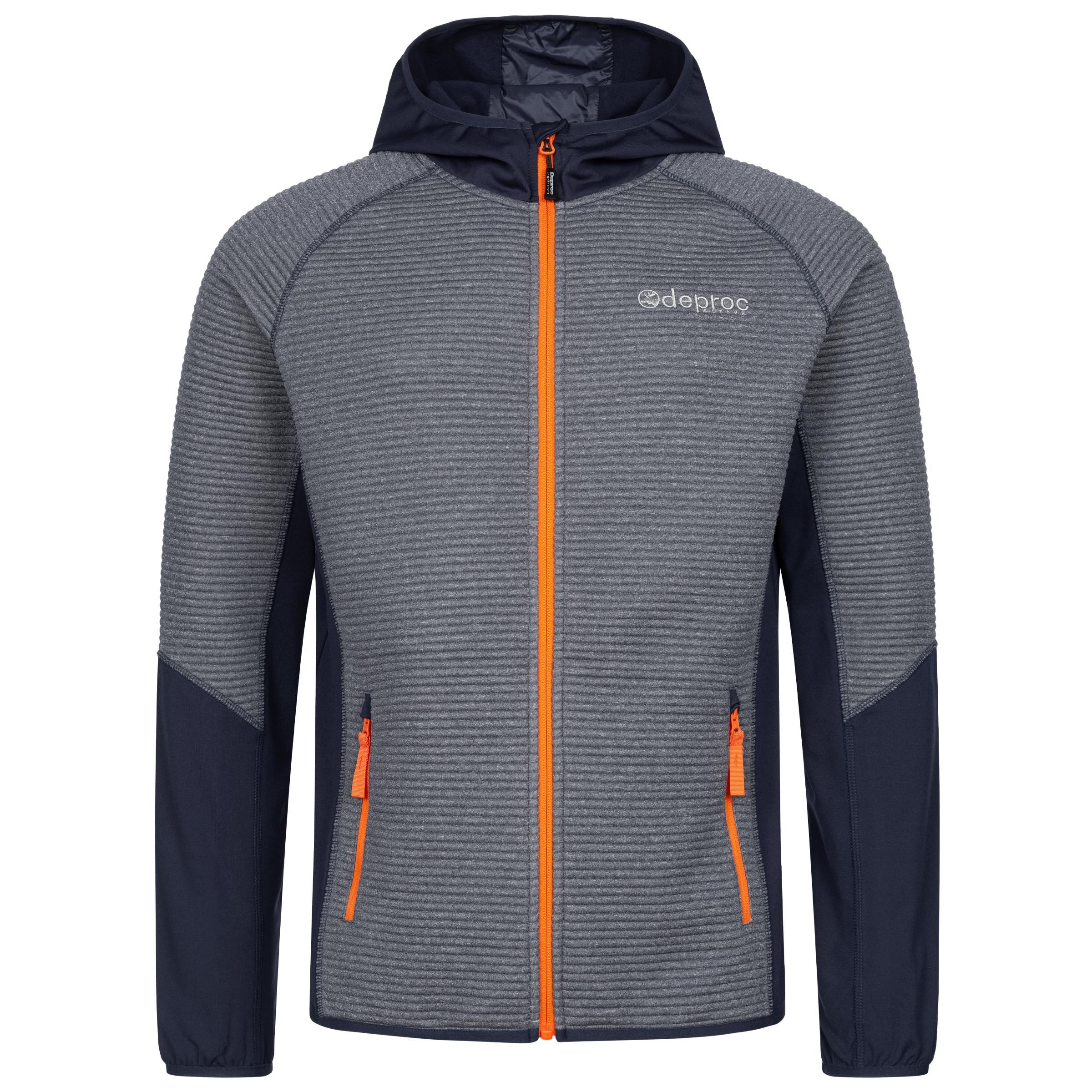 Ultraleichte Midlayer-Jacke in sportiver Optik: ELM Men. Mit der Strickfleecejacke ELM MEN präsentiert DEPROC active einen ultraleichten Midlayer im außergewöhnlichen Materialmix. Obendrein setzen Outdoorfans damit ganz klare Fashion-Impulse. Das strukturierte, geriffelte Hauptmaterial passt sich dem Körper perfekt an und wartet mit einer hervorragenden Wärmeleistung bei gleichzeitigem Feuchtigkeitstransport auf. Die Softshelleinsätze im Rücken, an den Seiten und den Armen sorgen für einen tollen Kontrast. Armabschlüsse und unterer Saum sind elastisch eingefasst. Dies sorgt für einen guten und bequemen Sitz und auch der Wärmerückhalt wird dadurch gewährleistet. Auch die Kapuze ist mit einem Elastikband versehen, wodurch sie perfekt am Kopf anliegt. Innen ist diese im Mittel- und Nackenbereich mit einem leichten Taftfutter ausgestattet. Das sieht nicht nur toll aus, sondern erleichtert es auch, die Kapuze über ein Beanie zu ziehen. 2 seitliche Einschubtaschen bieten viel Stauraum und sind mit Reißverschluss verschließbar. Die farbig abgesetzten Reißverschlüsse geben der Strickfleecejacke eine sportiven Charakter. Die Jacke eignet sich optimal für Berg- und Trekkingtouren mit wenig Platz im Gepäck. Sie kann sowohl als äußere Schicht wie auch als wärmende Zwischenschicht getragen werden und wird somit zum Ganzjahresbegleiter.