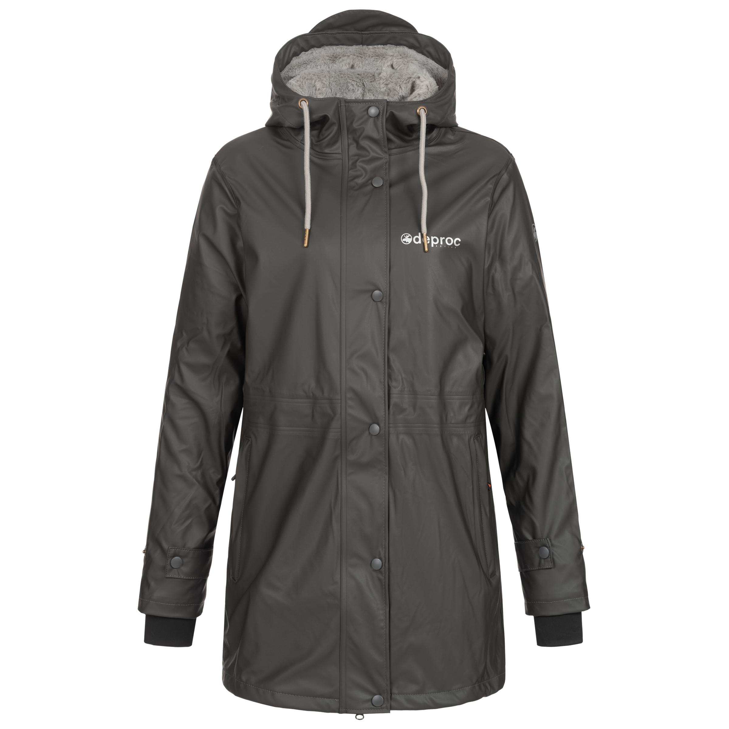 Der Klassiker unter den Friesen kommt nun im neuen Farbgewand! Die Regenjacke NEW ELLESMERE Women von DEPROC active überzeugt im klassisch nordischen Look mit absoluter Zuverlässigkeit. Absolut dicht wird NEW ELLESMERE nicht nur durch das wasserdichte Außenmaterial, sondern auch durch die verschweißten Nähte. Innen wird der Regenmantel von einem weichen und besonders edlen Futter ergänzt. Die Ärmel sind ebenfalls gefüttert und mit einem zusätzlichen Taffetafutter ausgestattet. Das ermöglicht ein leichtes Hineingleiten in die Jacke, ohne dass die Ärmel von Bluse oder Pullover nach oben rutschen. Die Kapuze ist mit einer Kontrastkordel versehen, die farblich zum Innenfutter passt. Die Weiten der Taille kann mit einem verdeckten Kordelzug von der Jackeninnenseite reguliert werden. Der 2-Wege-Reißverschluss wird von einer Windschutzblende geschützt. Die beiden äußeren Eingrifftaschen können mit Reißverschluss verschlossen werden. Zusätzlich bietet eine innenliegende Brusttasche ausreichend Platz für Smartphone & Co. Mit dieser Regenjacke freut man sich garantiert auf den nächsten Regen!