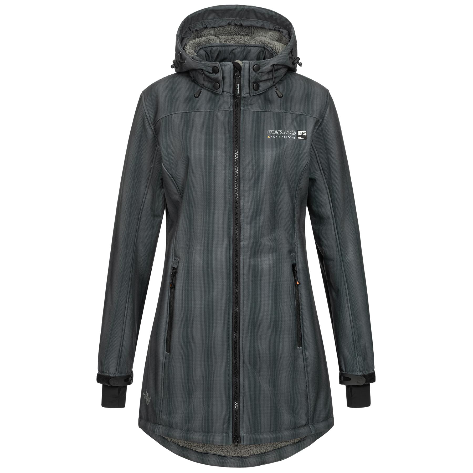 Der Keele Peak Softshellmantel für Damen ist ein besonders schicker atmungsaktiver Kurzmantel aus der Outdoorkollektion von Deproc. Elegant geschnitten ist der Kurzmantel das neue Lieblingsstück für die Wintersaison. An kalten Tagen wärmt das kuschelige hochflorige Fleece auf der Innenseite den Körper und fühlt sich auf der Haut wunderbar weich an. Der Mantel schützt bei eisigem Wind sogar die Hüfte und ein Stück weit die Oberschenkel. Der atmungsaktive Stoff auf der Außenseite besteht aus 96 % Polyamid und 4 % Elastan. Aufgrund des Polyamids ist die Oberfläche unempfindlich, winddicht und wasserabweisend. Der Elastananteil macht das Gewebe elastisch und bewirkt, dass der Stoff sich intensiven Bewegungen anpasst. Der atmungsaktive Softshellmantel von Deproc bietet diverse nützliche Details. So kann die Kapuze in der Weite verstellt und bei gutem Wetter abgenommen werden. Auf der Ärmelinnenseite sind Stulpen eingenäht, die für angenehme Wärme sorgen. Die zwei Außentaschen können sicher mit Reißverschlüssen verschlossen werden. Auch zwei größere Innentaschen gibt es. In einer weiteren kleinen Tasche auf der Innenseite ist Platz für das Handy.