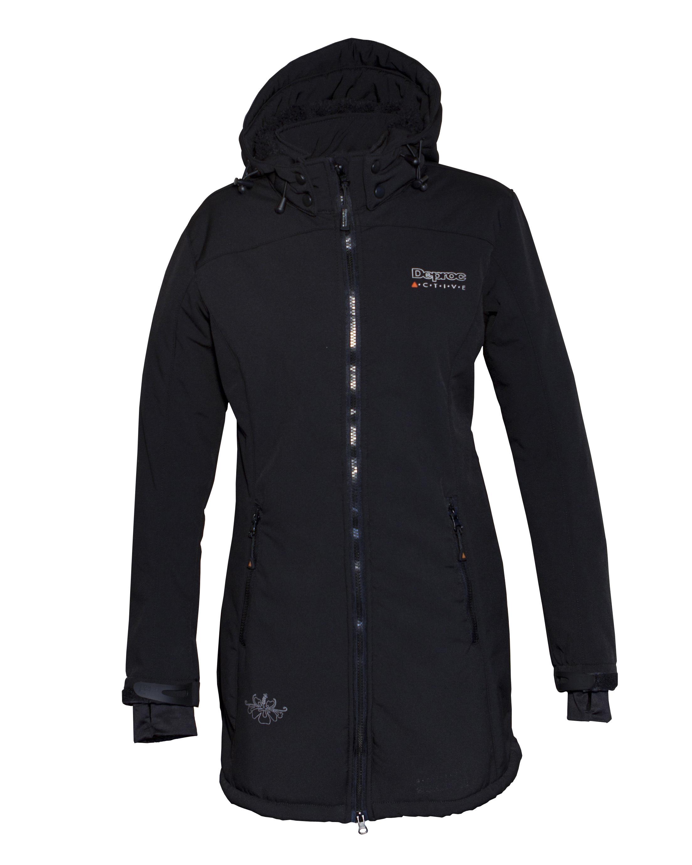 Der Keele Peak Softshellmantel für Damen ist ein besonders schicker atmungsaktiver Kurzmantel aus der Outdoorkollektion von Deproc. Elegant geschnitten ist der Kurzmantel das neue Lieblingsstück für die Wintersaison. An kalten Tagen wärmt das kuschelige hochflorige Fleece auf der Innenseite den Körper und fühlt sich auf der Haut wunderbar weich an. Der Mantel schützt bei eisigem Wind sogar die Hüfte und ein Stück weit die Oberschenkel. Der atmungsaktive Stoff auf der Außenseite besteht aus 96 % Polyamid und 4 % Elastan. Aufgrund des Polyamids ist die Oberfläche unempfindlich, winddicht und wasserabweisend. Der Elastananteil macht das Gewebe elastisch und bewirkt, dass der Stoff sich intensiven Bewegungen anpasst. Der atmungsaktive Softshellmantel von Deproc bietet diverse nützliche Details. So kann die Kapuze in der Weite verstellt und bei gutem Wetter abgenommen werden. Auf der Ärmelinnenseite sind Stulpen eingenäht, die für angenehme Wärme sorgen. Die zwei Außentaschen können sicher mit Reißverschlüssen verschlossen werden. Auch zwei größere Innentaschen gibt es. In einer weiteren kleinen Tasche auf der Innenseite ist Platz für das Handy.