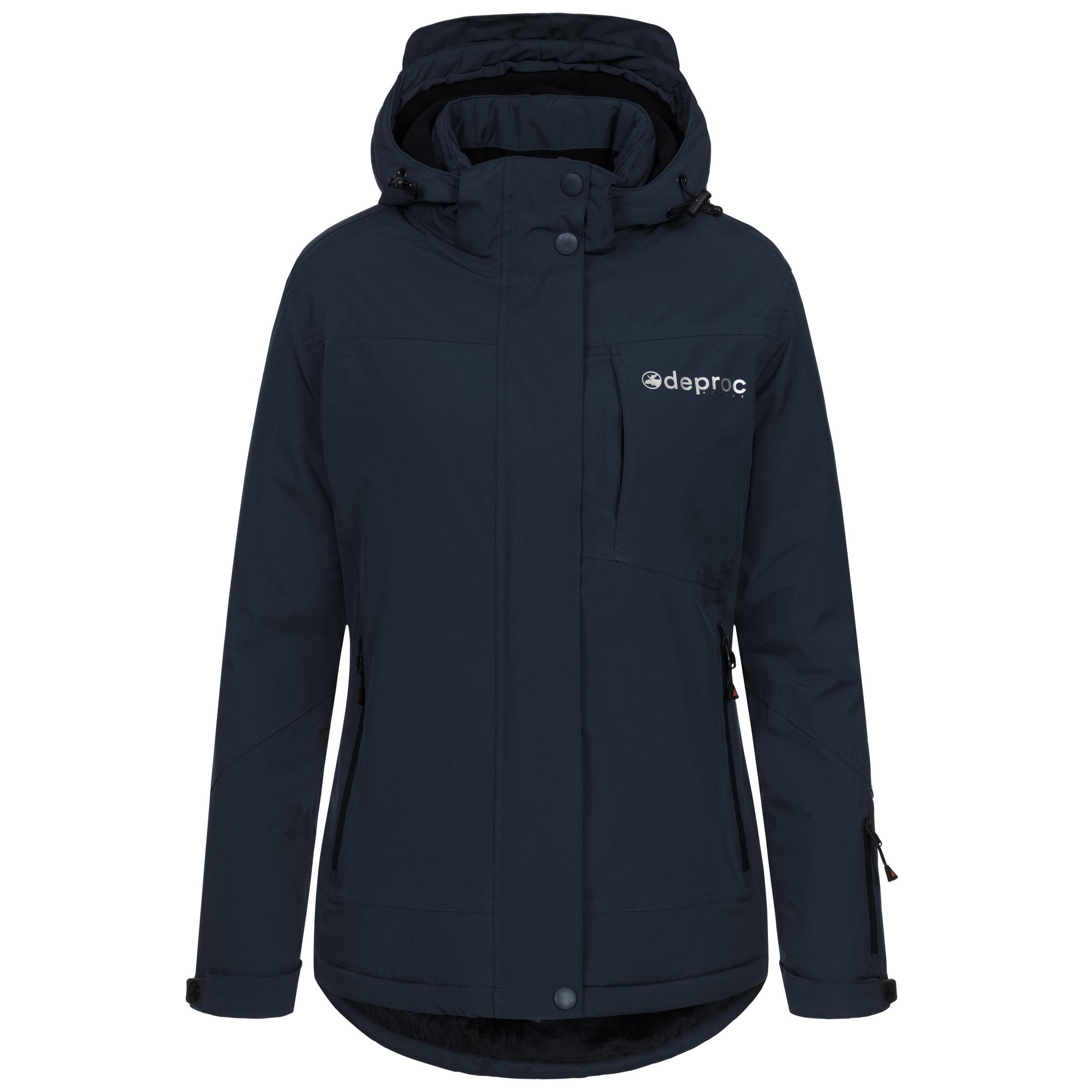 Mit der Übergangsjacke MONTREAL LADY vom Outdoor Spezialisten Deproc ist man bei jeder Wetterlage bestens gerüstet. Leicht gefüttert und mit langflorigem, seidig glänzendem Fleece versehen, ist diese Outdoorjacke für Damen ideal an kalten Tagen. Sie verfügt über beste Materialeigenschaften, ist atmungsaktiv, winddicht und wasserdicht bis 8.000 mm Wassersäule. Die getapten Nähte sorgen dafür, dass auch bei Regen und Schnee keine Feuchtigkeit ins Jackeninnere eindringt. Die Montreal Lady ist leicht tailliert feminin geschnitten. Der Schnitt der Damenjacke passt optimal zum klassischen Outfit für die Stadt. Auch für Wanderungen ist die atmungsaktive Jacke mit angenehmen Ärmelstulpen aus Fleece bestens geeignet. Die Kapuze ist in der Weite regulierbar, sodass in Kombination mit der festen Krempe ein wirksamer Schutz bei starken Regen- und Schneefällen erzielt wird. Sie kann je nach Witterung abgenommen und in der funktionalen Kapuzentasche verstaut werden. Darüber hinaus verfügt die Outdoorjacke von Deproc über weitere praktische Details. Auf den Unterarmseiten befinden sich integrierte Ventilationsreißverschlüsse, die auch bei intensiver körperlicher Bewegung die nötige Belüftung gewährleisten. Zwei Seitentaschen und eine Brusttasche bieten Platz für alles, was in der Stadt oder auf der Wanderung unbedingt dabei sein muss. Am linken Ärmel befindet sich eine in schicker Optik schräg angesetzte Tasche. Die Reißverschlüsse sind jeweils verdeckt angesetzt. Durch den herausnehmbaren Schneefang läßt sich die Damenjacke sowohl als Skijacke als auch als ganz normale Winter- & Freizeitjacke für die kalte Jahreszeit tragen.