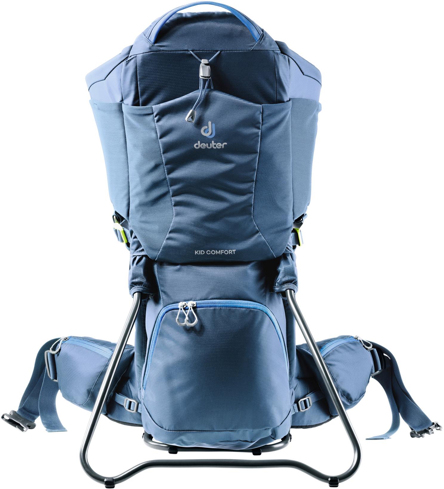 Deuter KID COMFORT. Hochwertige Kindertrage mit Aircomfort Sensic Vario Netzrücken System für perfekte Lastenübertragung und gleichzeitige Belüftung des Rückens; mit auf die individuelle Rückenlänge einstellbarem Vari Fit System und einem Ventilationsraum zwischen Kind und Träger; beide schwitzen weniger und ein Hitzestau wird vermieden; höhenverstellbare Fußstützen fördern die Durchblutung der Kinderbeine, diese bleiben länger warm und schlafen nicht ein; dank zwei stabiler Handgriffe und dem äußerst standfesten Aluminium-Rahmen mit breitem Klappfuß kann die Trage samt Kind vom Träger allein auf den Rücken gehoben und abgesetzt werden.
