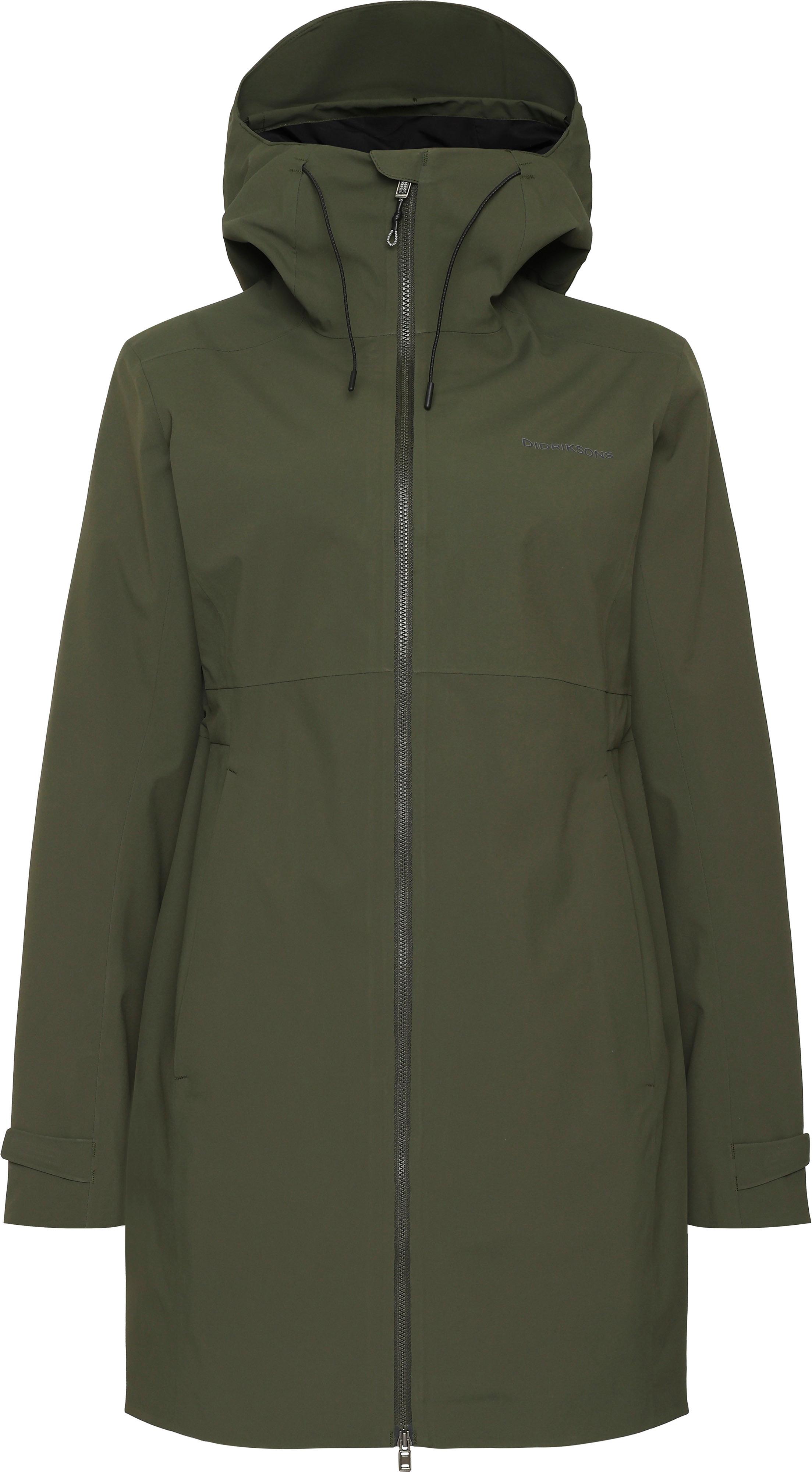 Sportiver Parka aus atmungsaktivem, wasser- und winddichtem Material; versiegelte Nähte; Wassersäule 10.000 mm; 2-Wege-Frontreißverschluss; verstellbare Kapuze, Taille und Ärmelabschlüsse; 2 Reißverschlusstaschen; Falte auf der leicht verlängerten Rückseite für eine feminine Passform; reflektierende Details; ohne PFC hergestellte, wasserabweisende Imprägnierung; Material 100% Polyester.