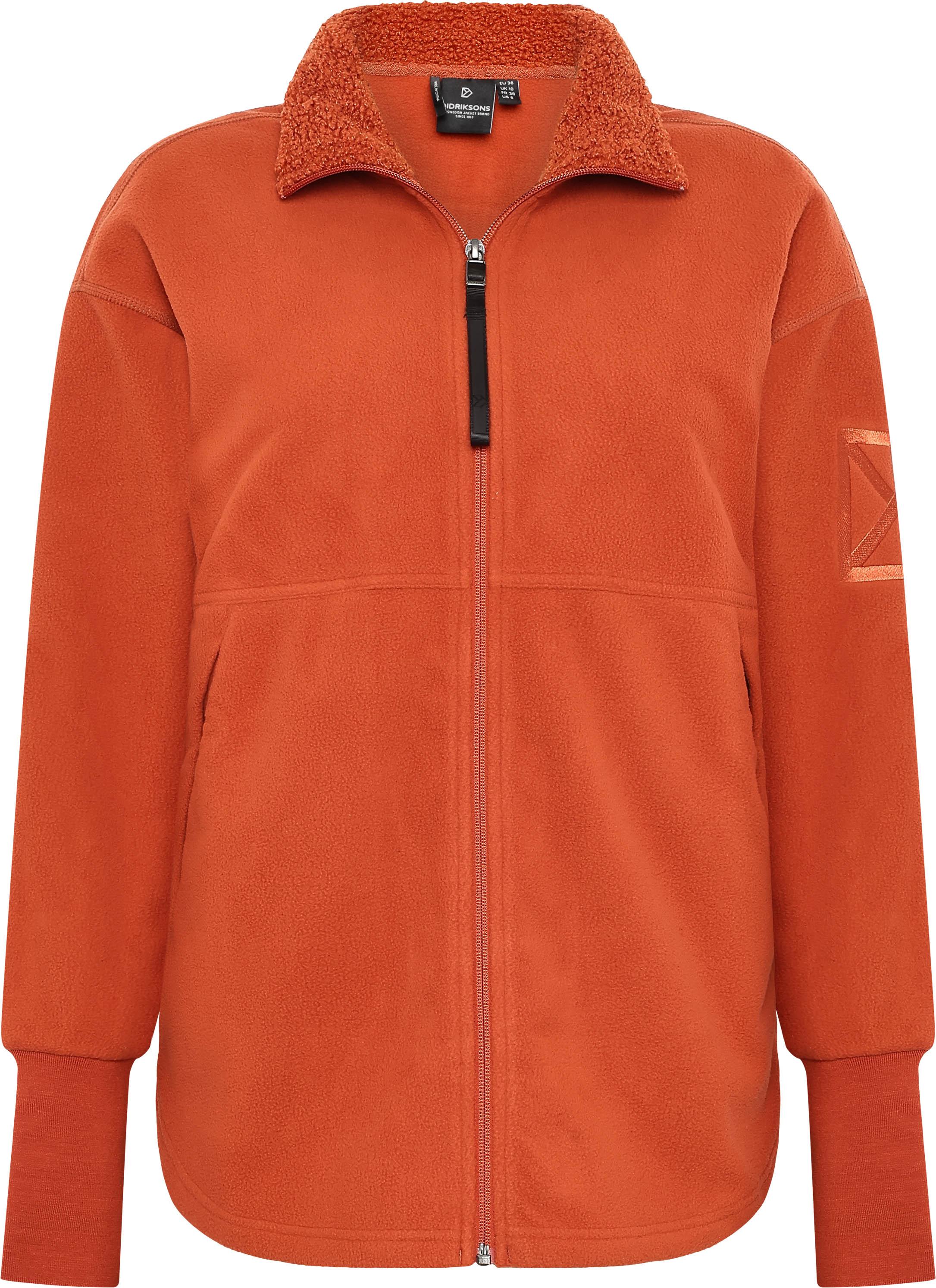 Winddichte Fleecejacke mit weichem Teddykragen; durchgehender Reißverschluss mit Zippverlängerung; seitliche Eingrifftaschen mit Knöpfen; breite Ärmelbündchen; abgerundeter, auf der Rückseite verlängerter Saum; normale Passform; mit Recyclingmaterial hergestellt; Material 100% Polyester.