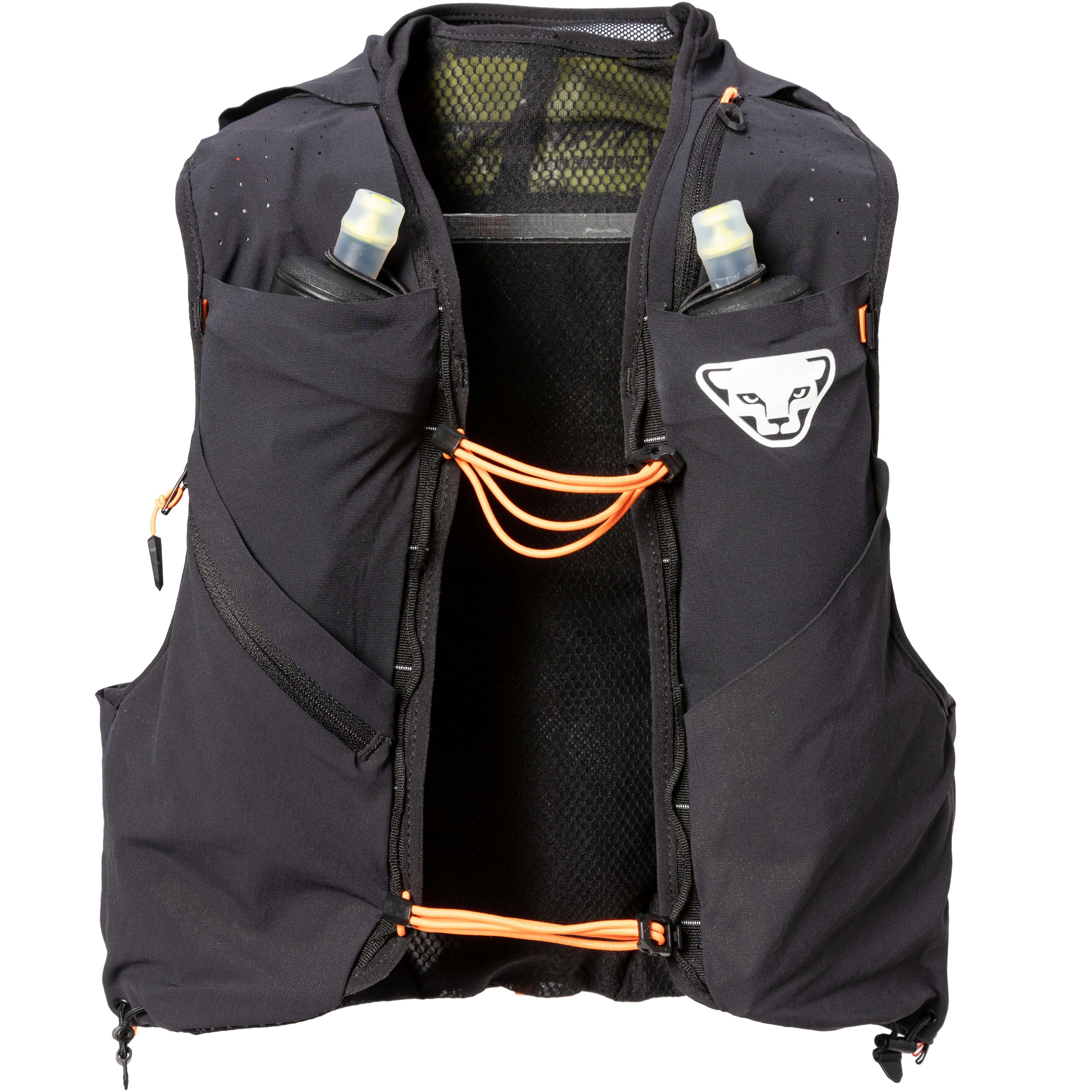 Laufrucksack in Westenform mit 12 Fächern; Innenseite aus unelastischem Mesh bietet Stabilität; komprimierbares Rückenfach; abnehmbare, wasserdichte Tasche, z.B. für ein Smartphone; seitlich verstellbare Passform; doppelter Verschluss aus elastischen Zugkordeln auf der Vorderseite; 3 verschiedene Möglichkeiten einer Stockhalterung; inklusive 2 x 500 ml Softflasks, welche in die 2 Taschen an den Trägern passen; Gewicht: ca. 190 g; Volumen: 12 l.