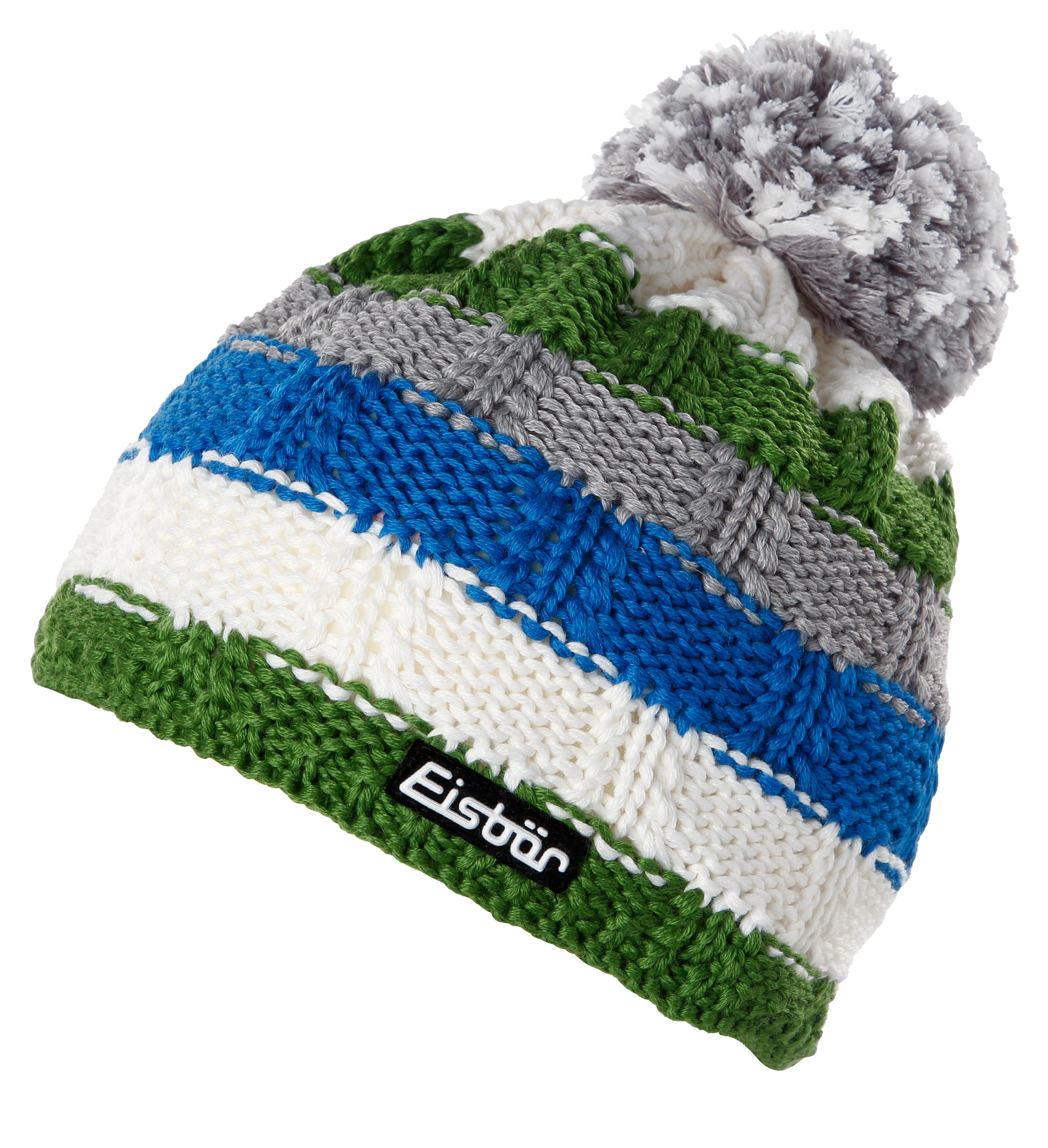Eisbär HEDI. Mehrfarbige Feinstrickmütze mit mehrfarbigem Bommel, Colorblock-Streifen und versetztem Rippenmuster; innen mit zusätzlich wärmendem Stirnband aus Fleece, außen mit Logodetail; Obermaterial 50% Wolle, 50% Polyacryl; Besatz 100% Polyester.