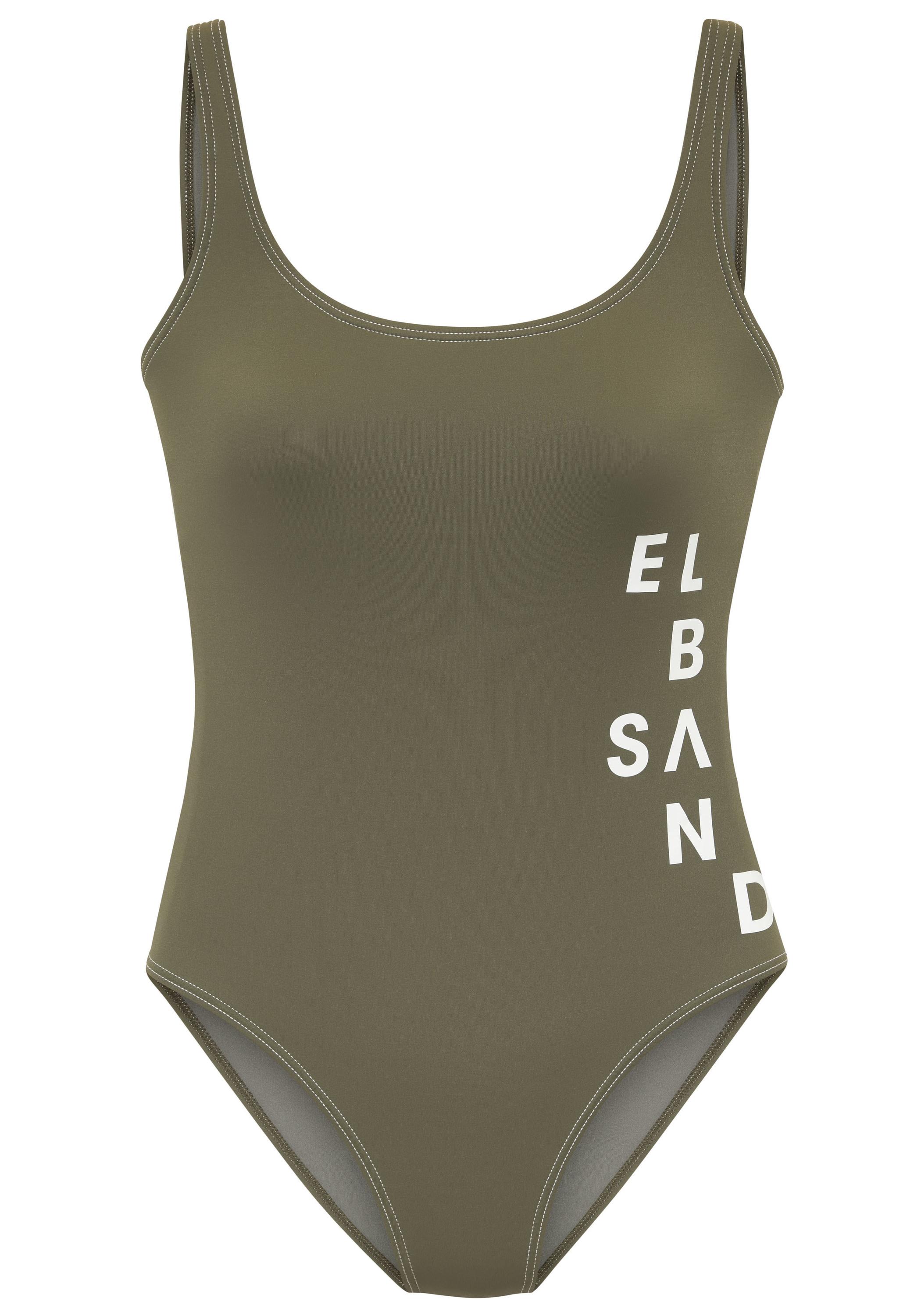 Badeanzug von Elbsand. Farblich abgesetzter Markenschriftzug. Kontrastfarbene Nähte. Herausnehmbare Cups. Runder Rückenausschnitt. Klassische Passform. Angenehmes Material mit einem Anteil an recyceltem Polyamid.