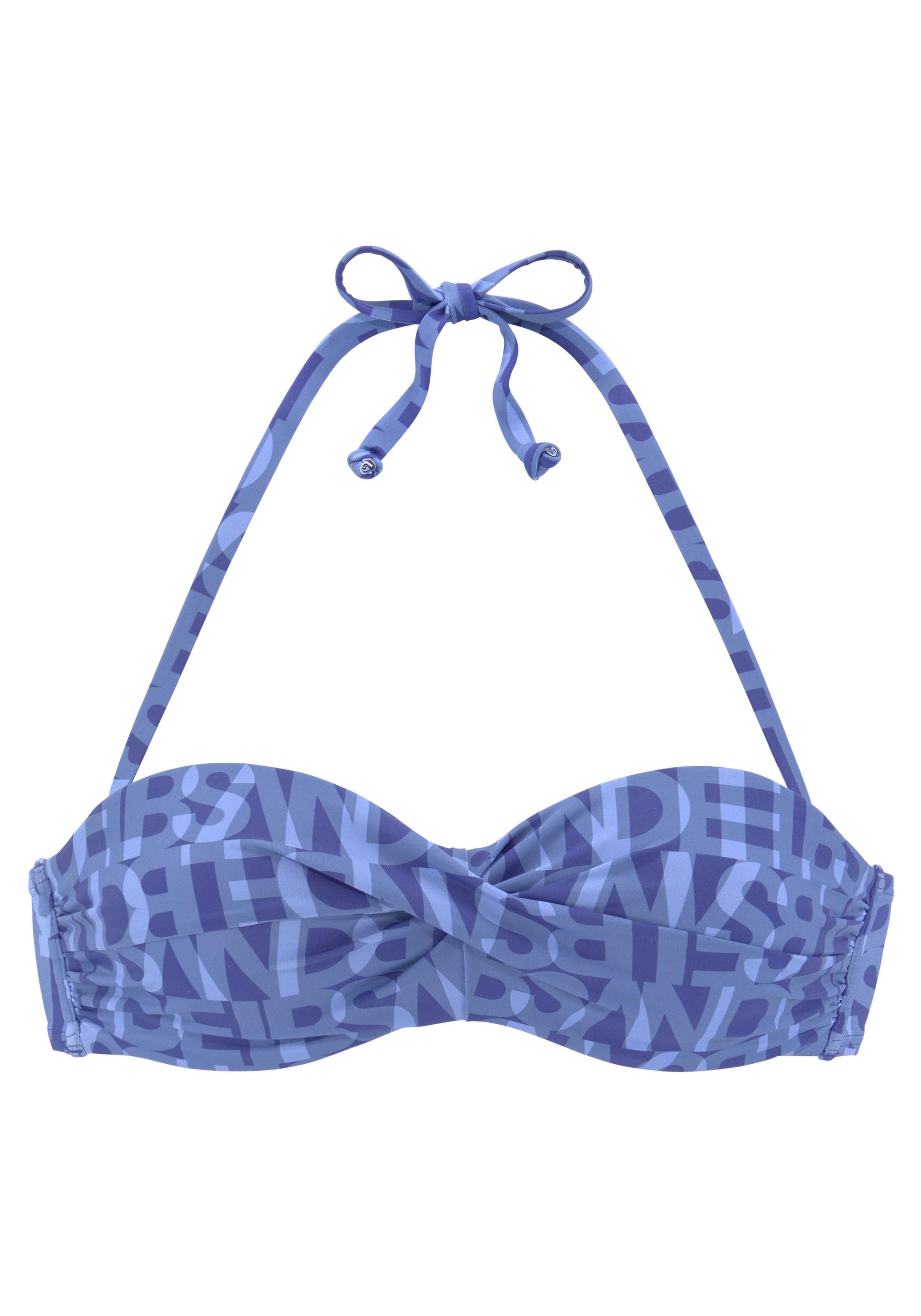 Bügel-Bandeau-Bikini-Top von Elbsand. Marken-Alloverprint in stylischer Optik. Cups mit herausnehmbaren Einlagen, abnehmbare Träger, seitliche Stäbchen für einen guten Halt. Necklace zum Binden. Aus recycelter Microfaser.