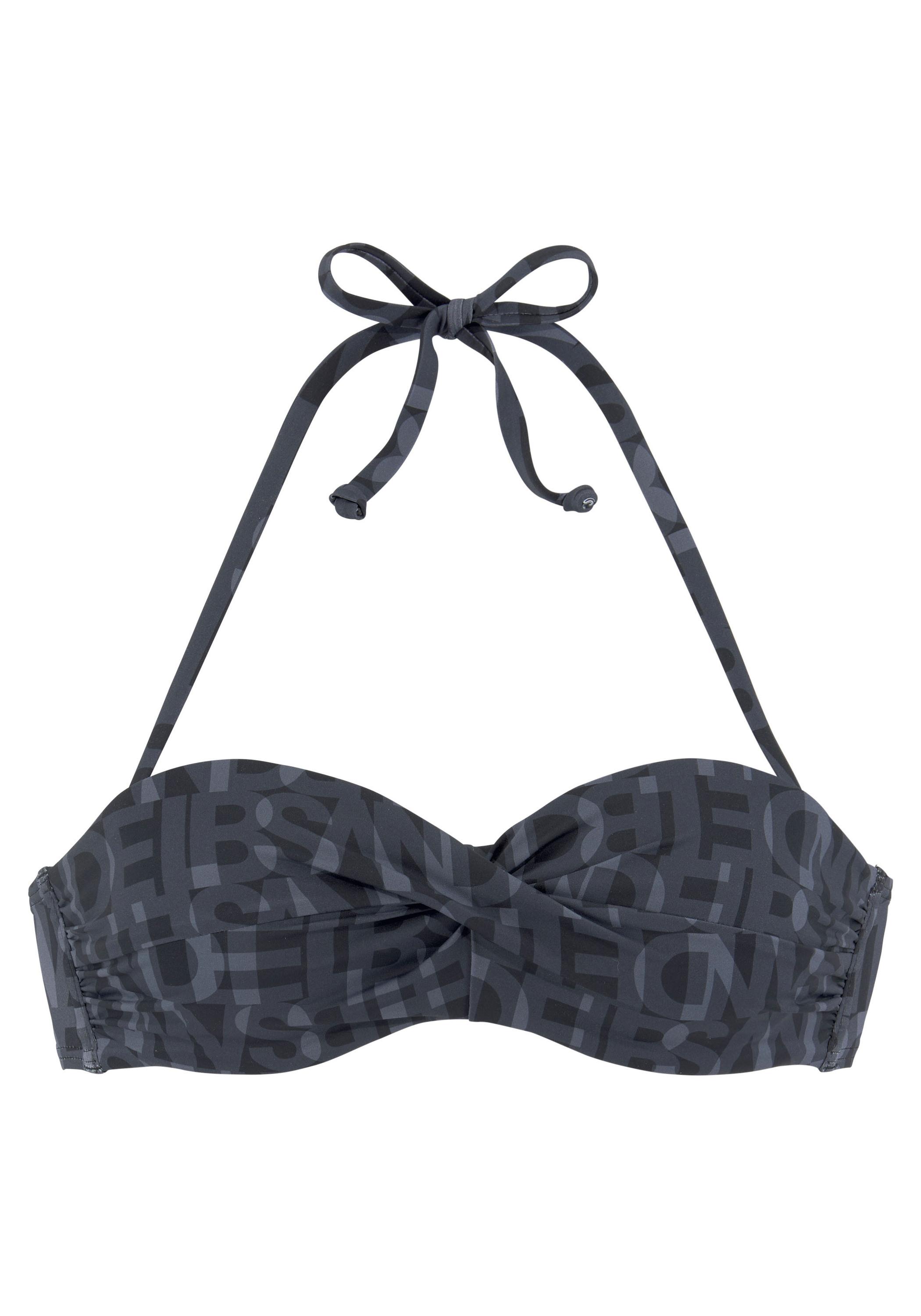 Bügel-Bandeau-Bikini-Top von Elbsand. Marken-Alloverprint in stylischer Optik. Cups mit herausnehmbaren Einlagen, abnehmbare Träger, seitliche Stäbchen für einen guten Halt. Necklace zum Binden. Aus recycelter Microfaser.