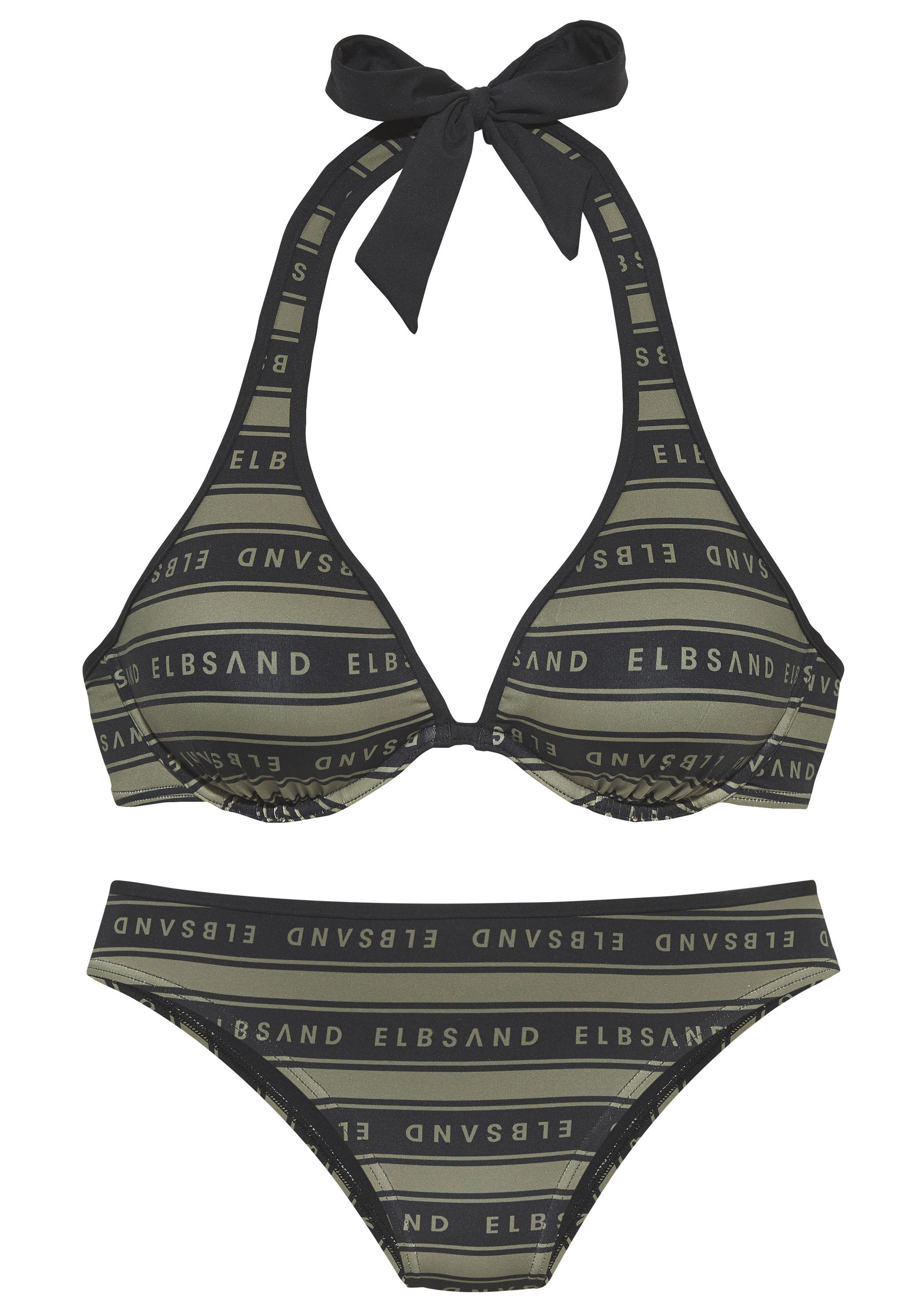 Bügel-Bikini von Elbsand. Streifenmuster mit Markenschriftzügen. Bikinitop mit breitem Neckholder zum Binden, Rückenschließe und herausnehmbaren Cups. Klassisch geschnittene Bikinihose. Angenehmes Material mit einem Anteil an recyceltem Polyamid.