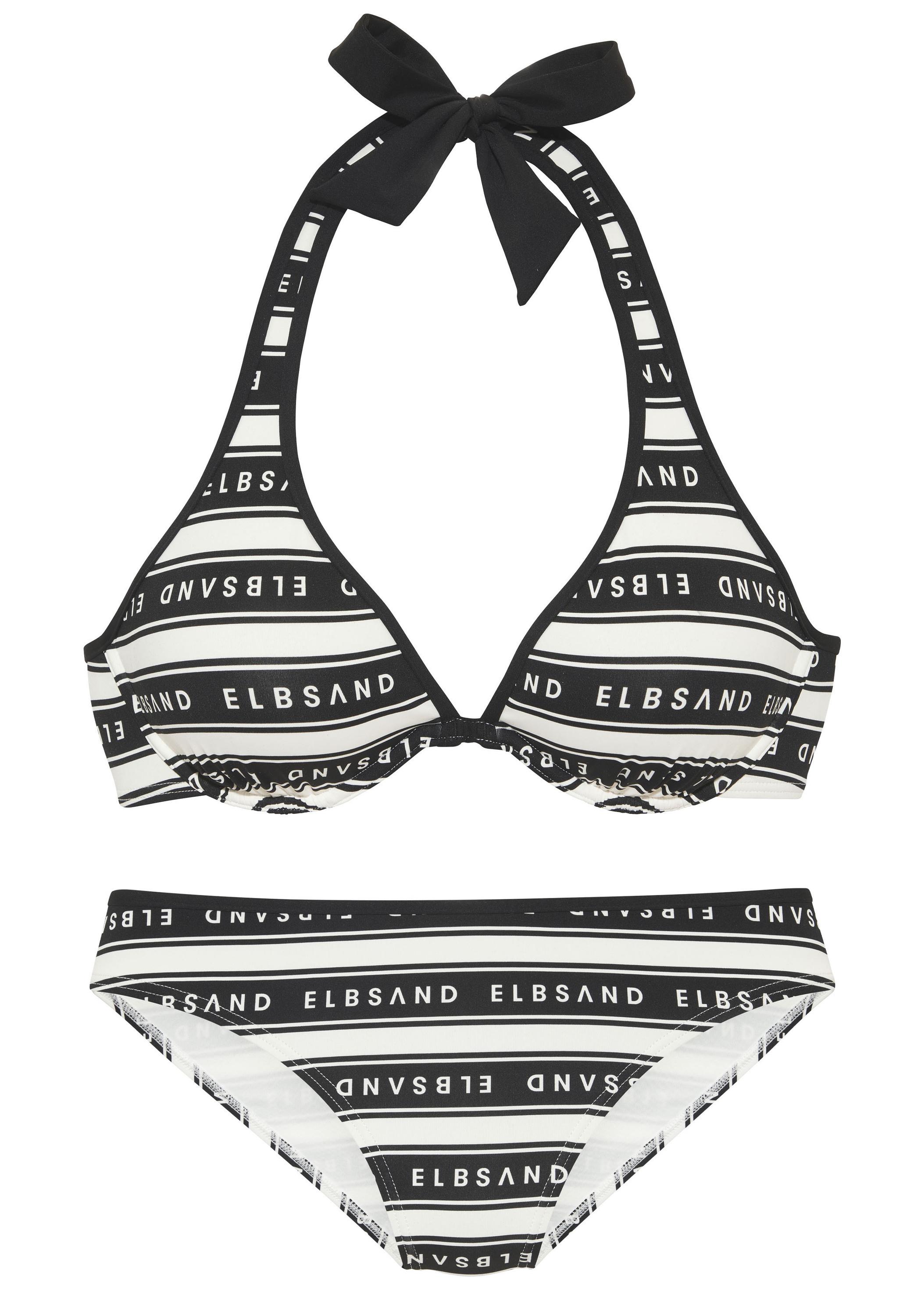 Bügel-Bikini von Elbsand. Streifenmuster mit Markenschriftzügen. Bikinitop mit breitem Neckholder zum Binden, Rückenschließe und herausnehmbaren Cups. Klassisch geschnittene Bikinihose. Angenehmes Material mit einem Anteil an recyceltem Polyamid.