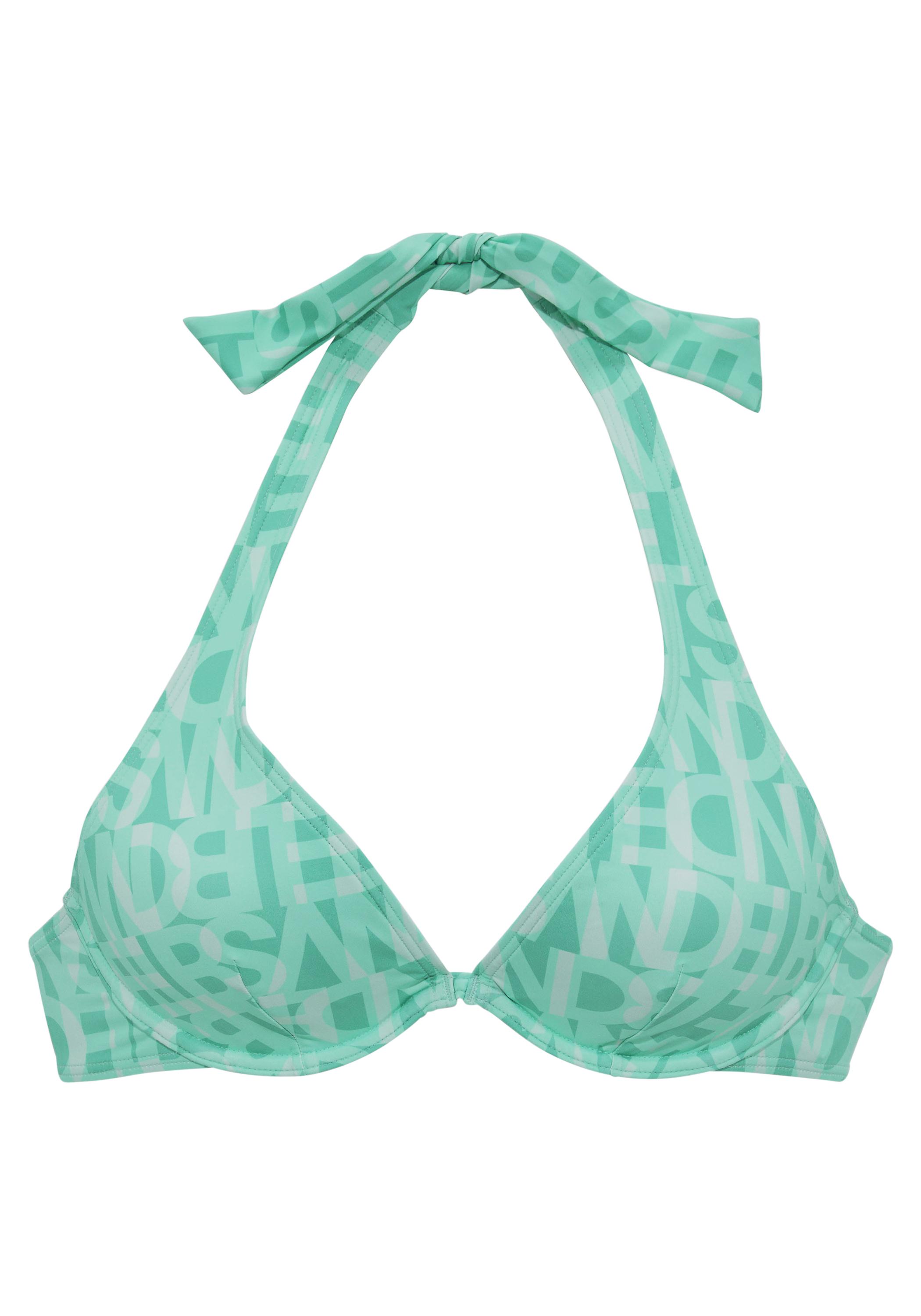 Bügel-Bikini-Top von Elbsand mit modischem Marken-Alloverprint. Cups mit formgebenden Bügeln und herausnehmbaren Einlagen. Breites Necklace zum Binden. Aus der Mix-Kini-Serie. Recycelte Microfaser.