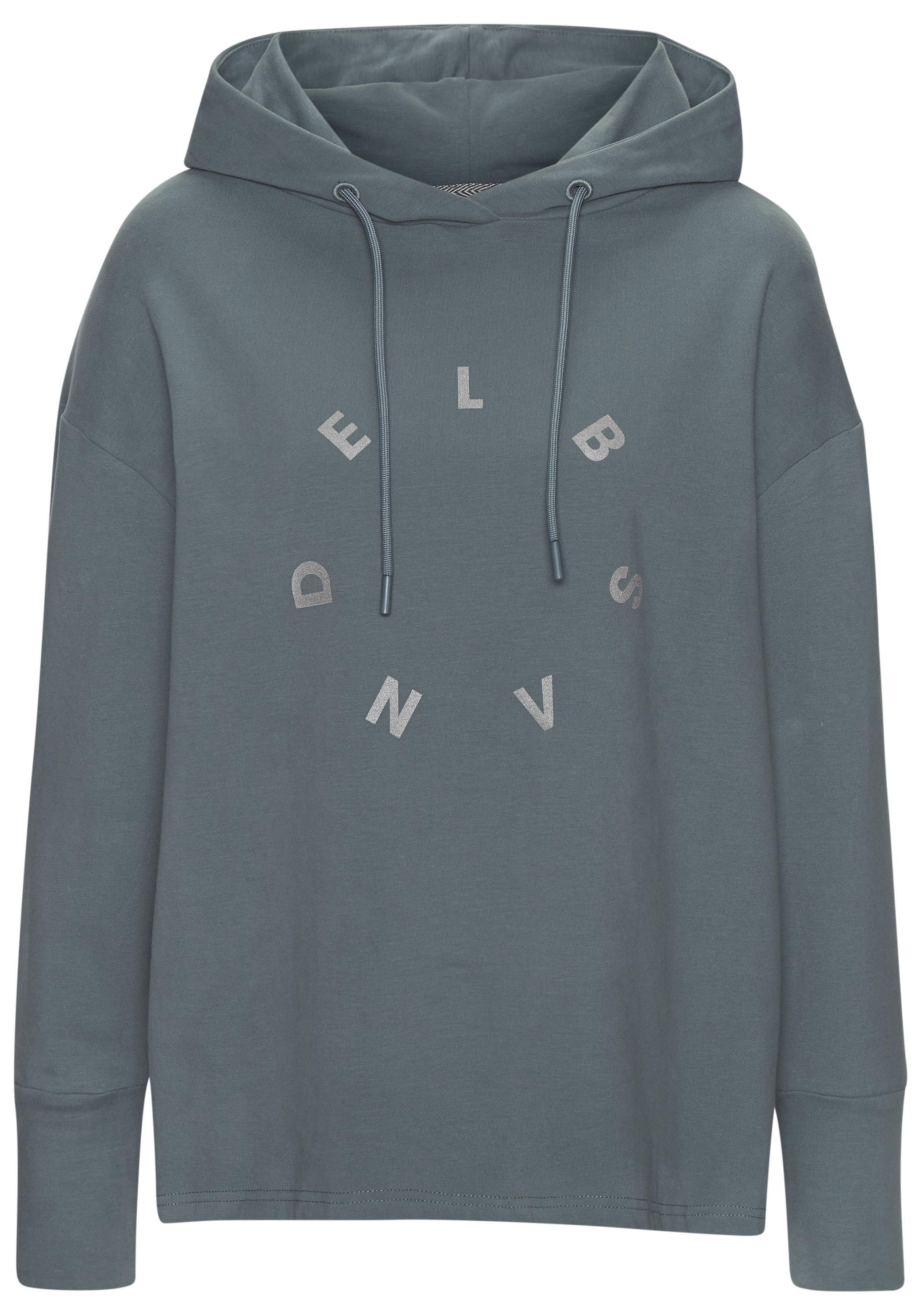Bequemer Hoodie von Elbsand mit leicht glänzendem Labelprint vorn. Überschnittene Schultern. Gefütterte Kapuze. Breite Bündchen am Ärmel. Toll zu Jeans und Shorts. Weiche, innen angeraute Sweatware.