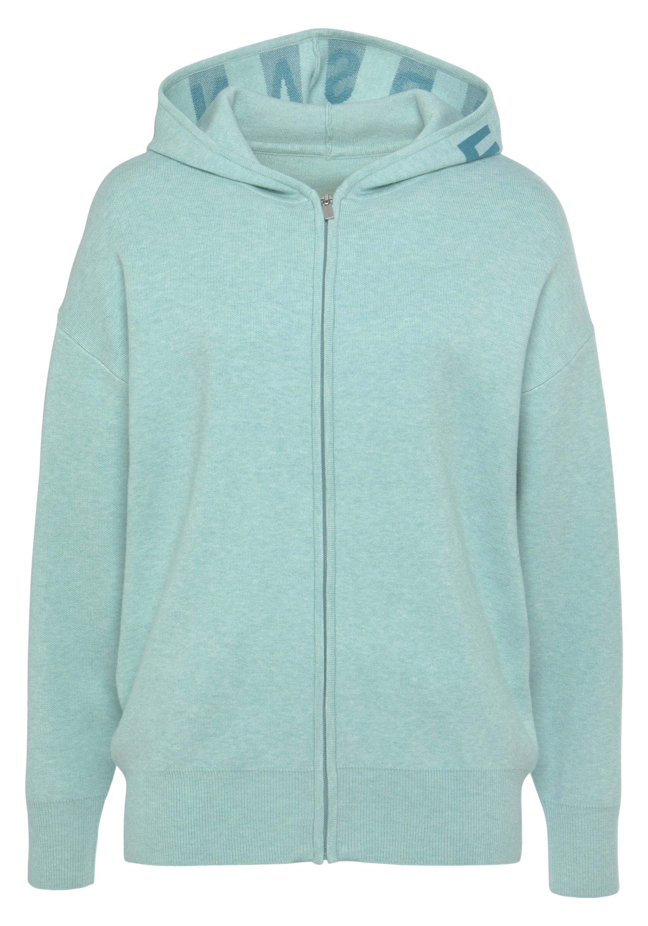 Gemütliche Strickjacke von Elbsand mit Markenschriftzug entlang der Kapuze. Durchgehender Reißverschluss. Lange Ärmel und Saum mit Rippbündchen. Lockere Passform mit überschnittenen Schultern. Weiche Strickware mit Viskose.