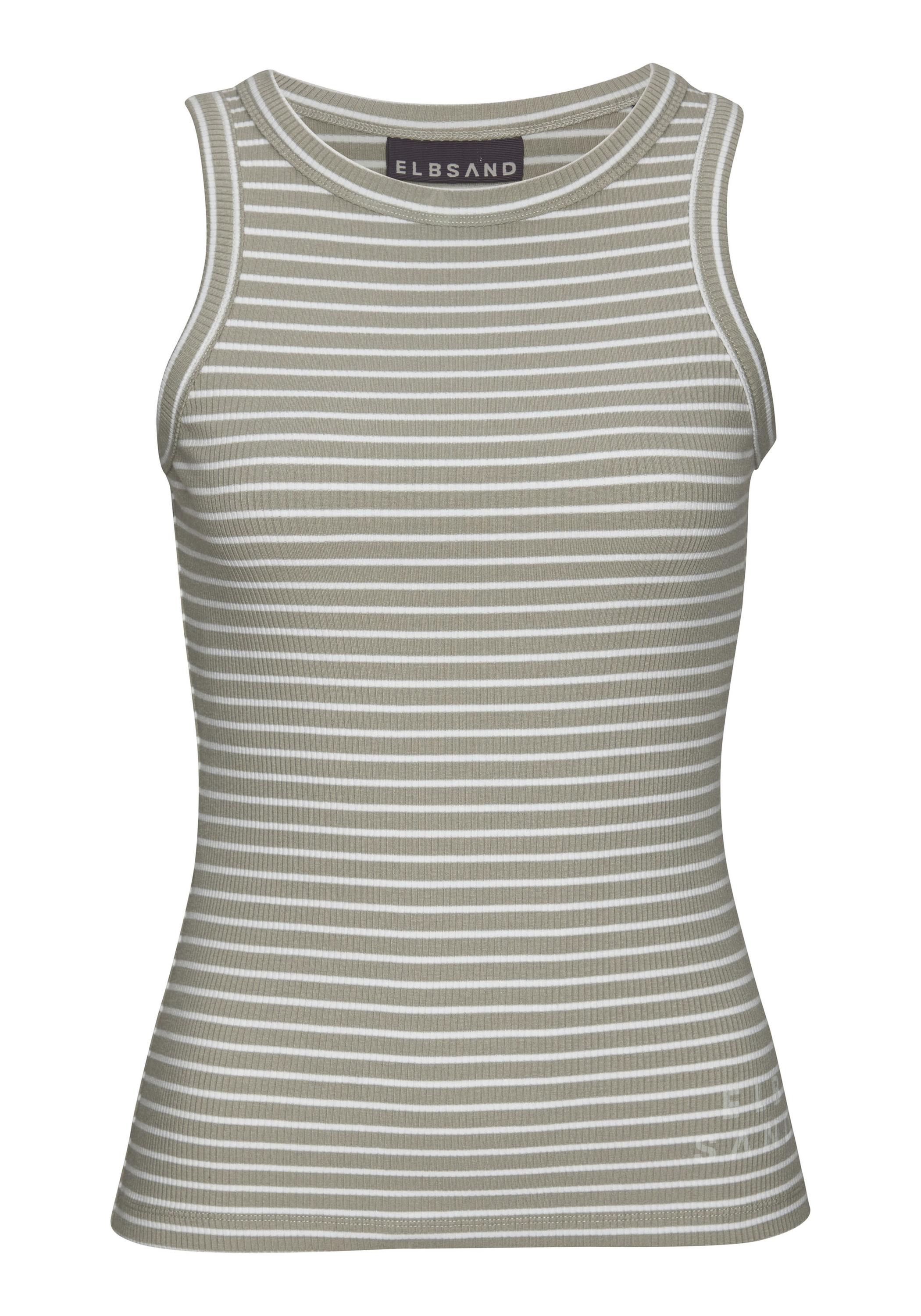 Ripptop von Elbsand im maritimen Streifen-Look. Rundhalsausschnitt und breite Träger. Kleiner Markendruck über dem Saum. Figurnah geschnitten. Weiche Jerseyware aus Modal und Baumwolle.