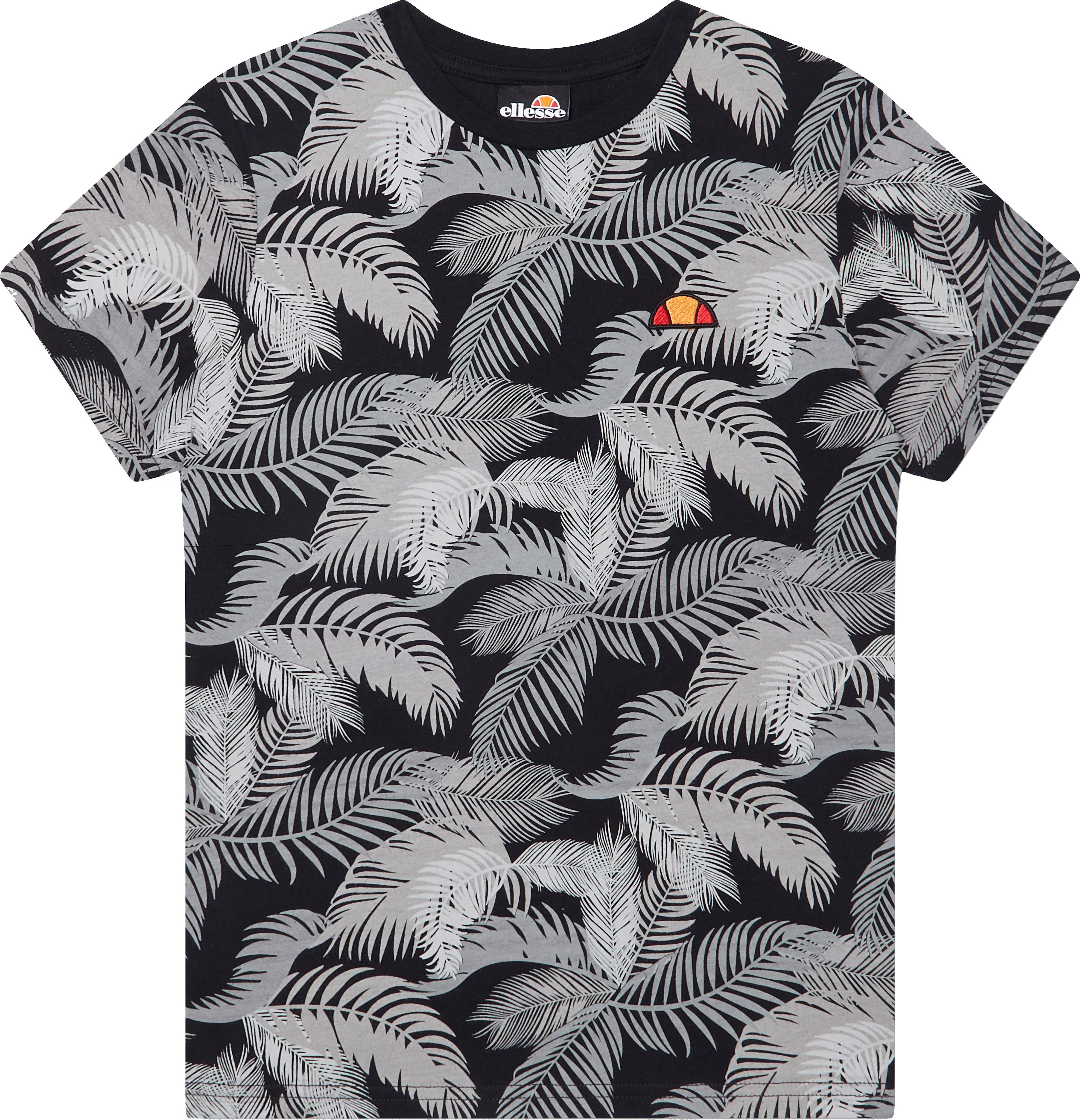 T-Shirt mit Blätterprint; runder Halsausschnitt; Logodetail auf der Brust; gerader Schnitt; Material 100% Baumwolle.