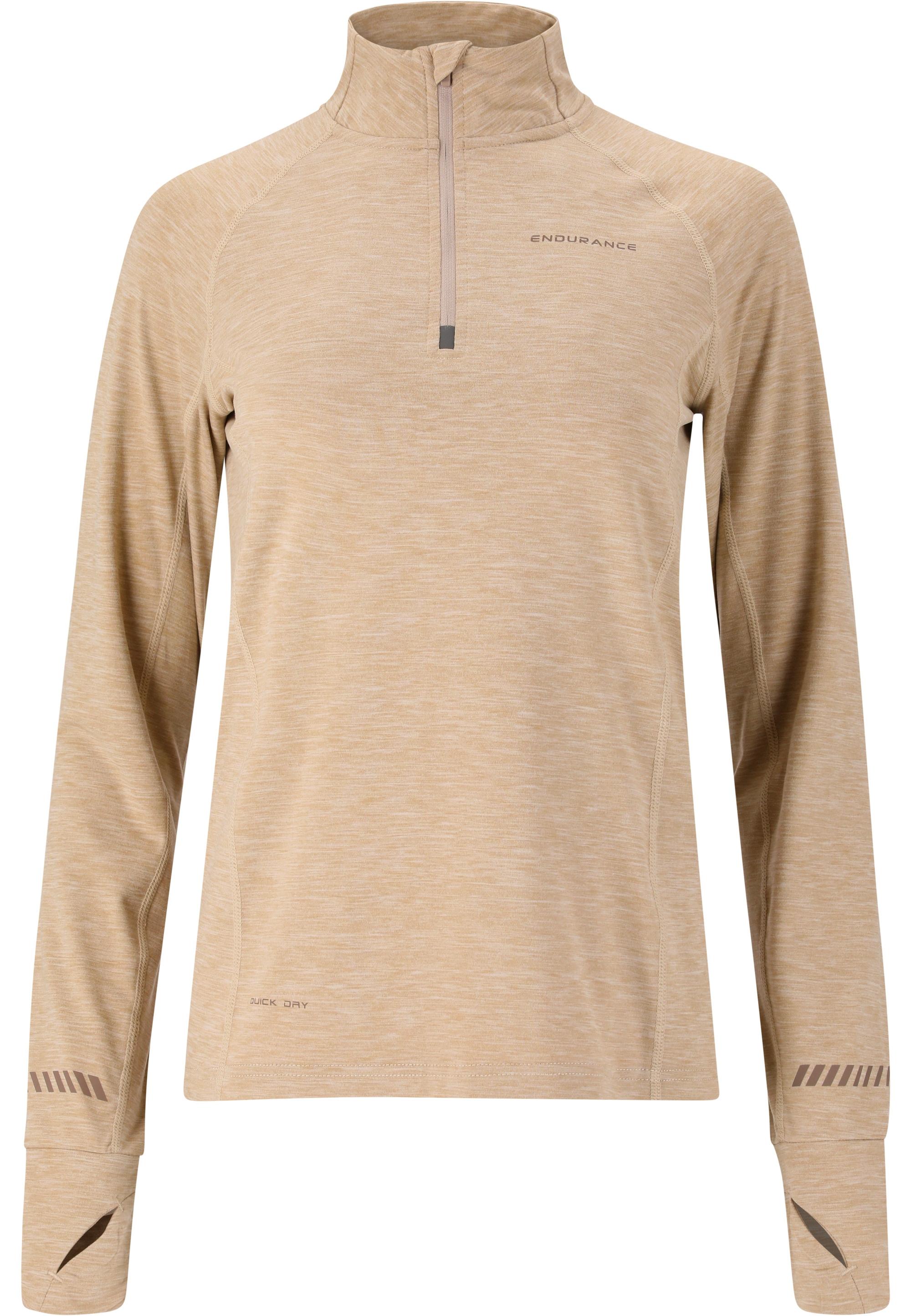 Das neue und vielseitige Funktionsshirt CANNA V2 MELANGE PERFORMANCE für Damen von ENDURANCE überzeugt durch maximale Bewegungsfreiheit sowie hervorragenden Tragekomfort. Es lässt sich schnell und universell zum coolen Sportoutfit kombinieren. Das atmungsaktive Material mit der QUICK DRY-Technologie leitet Feuchtigkeit von der Haut ab undlässt sie dadurch schneller verdunsten. Es sorgt für ein angenehmes, trockenes Tragegefühl und verhindert ein Auskühlen. Der Stehkragen mit kurzem Reißverschluss bietet Schutz vor Wind, während Daumenöffnungen ein Verrutschen der Ärmel verhindern. Die vielen kleinen reflektierenden Elemente gewährleisten zudem mehr Sicherheit im Straßenverkehr bei Dunkelheit. Abgerundet wird das Paket durch die schöne Melange-Qualität und das sportliche, schlichte Design. Ein top Preis-Leistungsverhältnis gibt es obendrein! Material: 88 % Polyester, 12 % Elastane