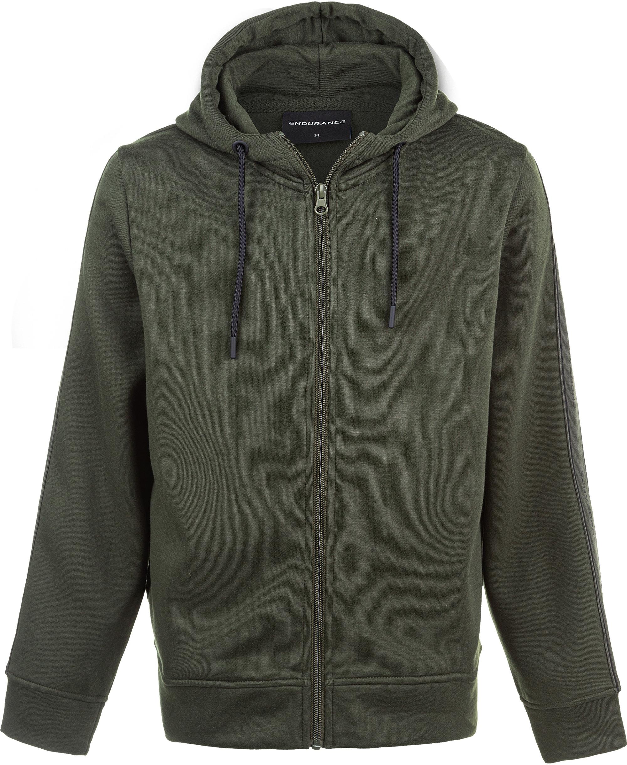 Die unifarbene Sweatjacke Uline von Endurance für Kinder hat elastische Bündchen an Ärmeln wie Saum und nützliche Taschen an den Seiten für kleine Utensilien oder die Hände. Dank der Materialzusammensetzung – Baumwolle und Polyester – ist die Jacke besonders weich und gemütlich. Die Kapuze wärmt den Kopf und kann mit der Kordel individuell angepasst werden. Sie kann bei der Ausübung diverser Sportarten getragen werden oder auch einfach im Alltag.