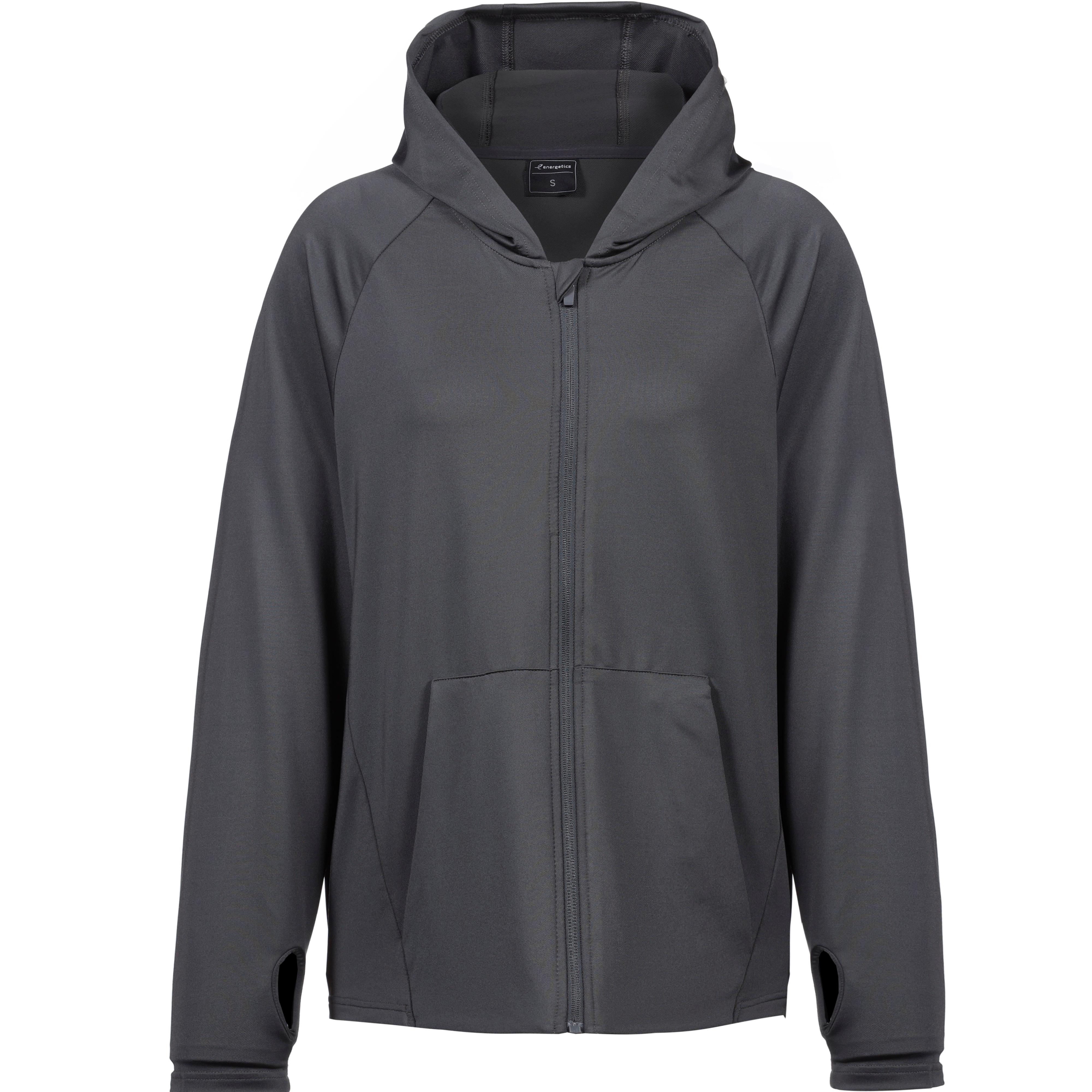 Laufjacke mit fester Kapuze; Frontreißverschluss und Kinnschutz; 2 Reißverschlusstaschen; Ärmelabschlüsse mit Uhrenöffnung; Labelprint; Material 92% Polyester, 8% Elastan.