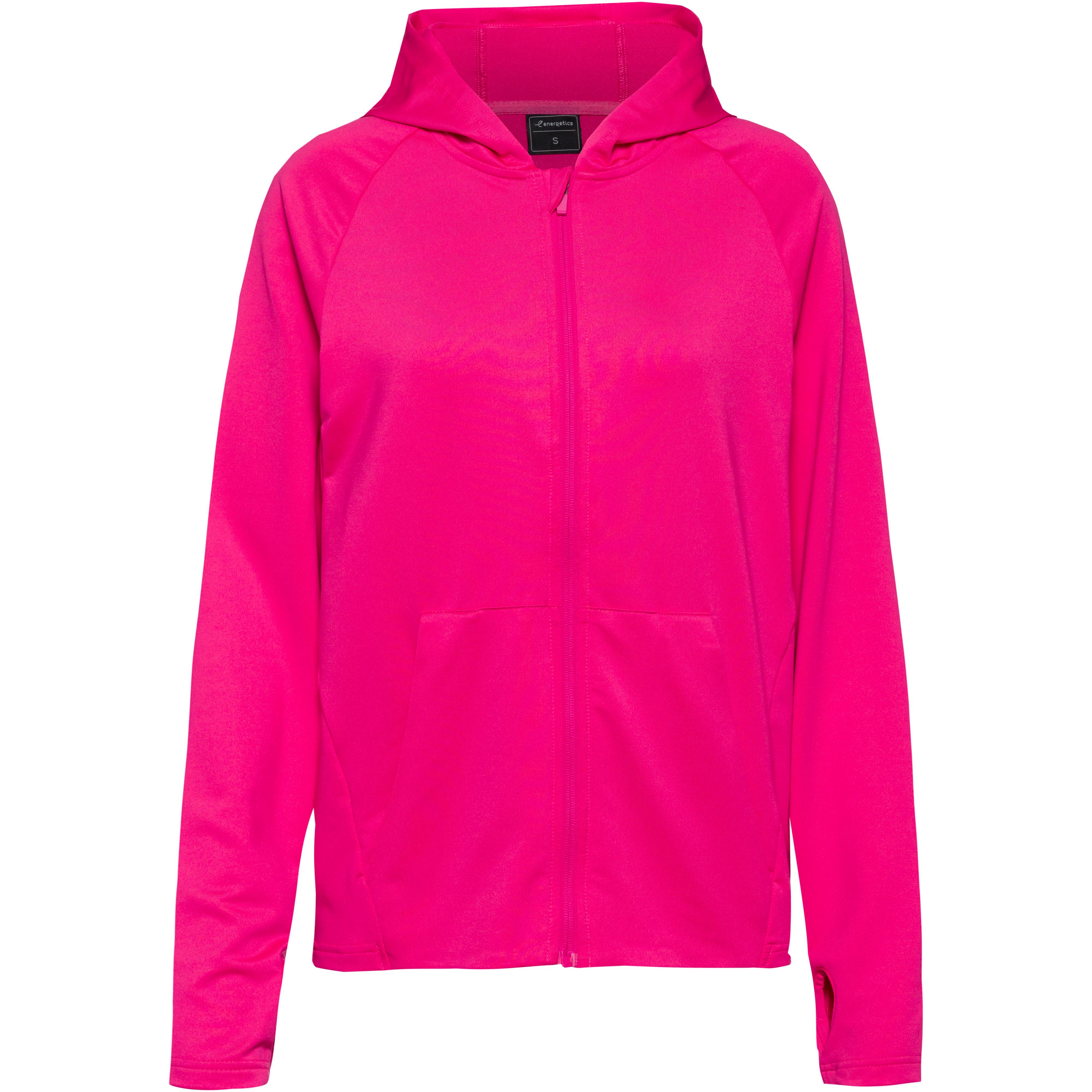 Laufjacke mit fester Kapuze; Frontreißverschluss und Kinnschutz; 2 Reißverschlusstaschen; Ärmelabschlüsse mit Uhrenöffnung; Labelprint; Material 92% Polyester, 8% Elastan.