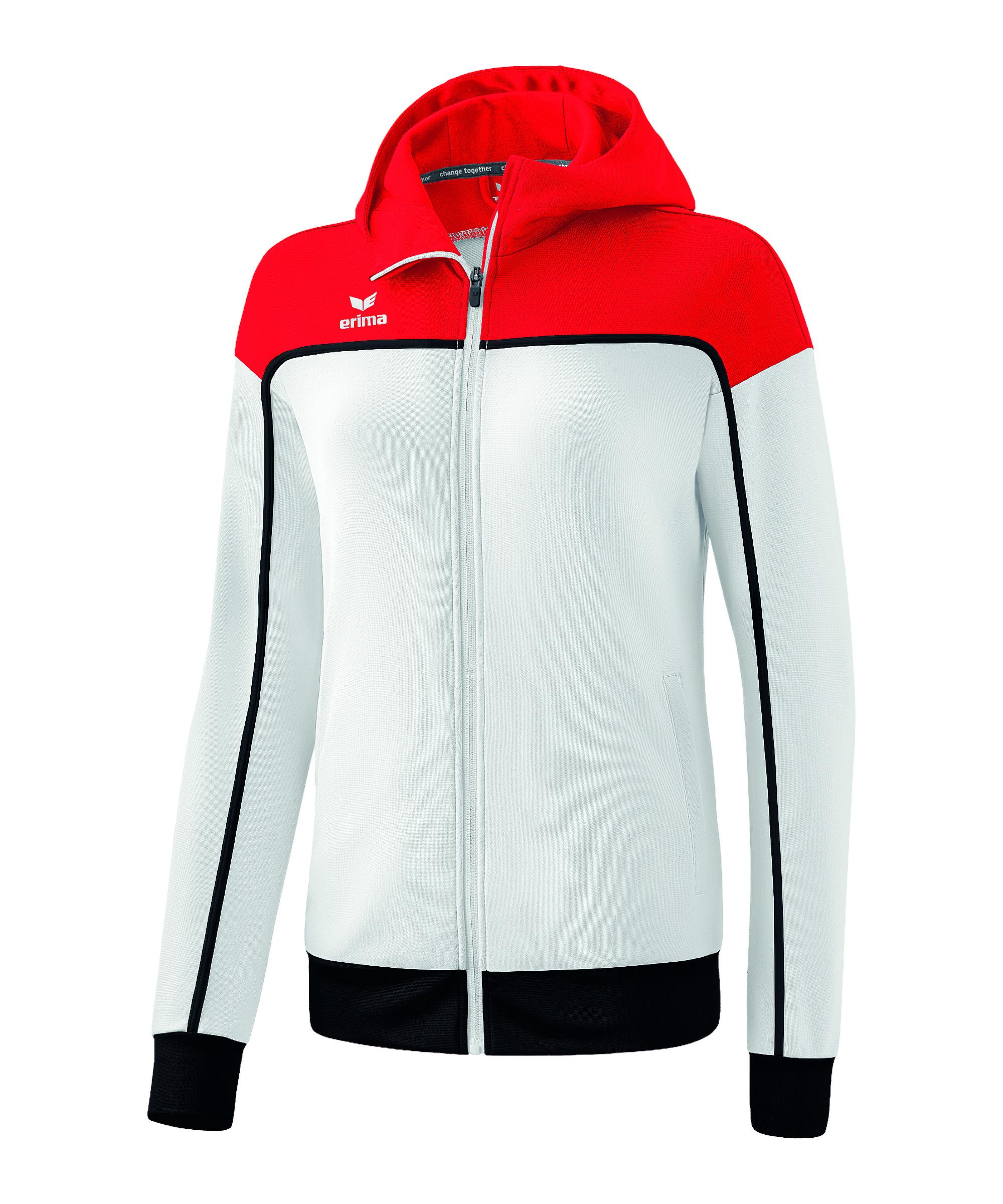 Erima bringt mit der Change Damen-Jacke in Weiß ein Produkt auf den Markt, mit dem ihr perfekt ausgestattet seid und selbst bei Regenwetter beweisen werdet, was in euch steckt. Sie ist atmungsaktiv, schweißableitend und wärmend. Hiermit bekommt ihr die passende Ausrüstung für das Training und die Aufwärmphase vor dem Match. Doch nicht nur beim Sport – auch abseits des Spielfelds beweist die Trainingsjacke echten Stil und praktische Funktionalität. Die Jacke bietet Stauraum durch die seitlichen Zipper-Taschen und wird durch einen Reißverschluss verschlossen. Optische Unterstützung bekommt diese langärmlige Jacke durch einen trendigen Stehkragen. Wenn der Wind pfeift, bleiben die Ohren dank der Kapuze schön warm. Produktdetails: Extras: Kapuze Seitliche Zipper-Taschen bieten Stauraum Ausschnitt: Stehkragen Langärmlig Eigenschaften: wärmend, schweißableitend, atmungsaktiv Material: 100% Polyester