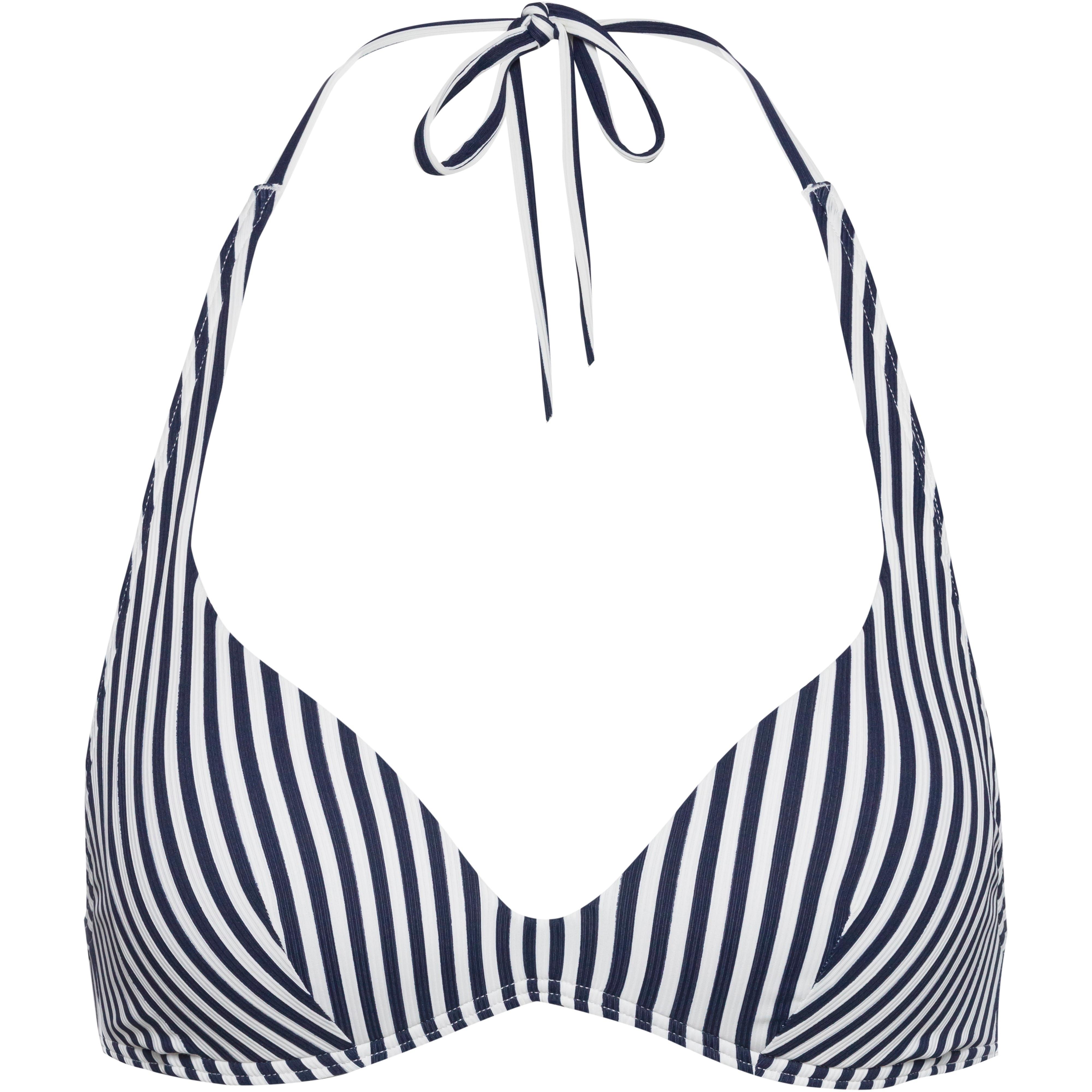 Neckholder-Bikini-Oberteil mit Streifen-Dessin; aus schnelltrocknendem Material; Bindung im Nacken; wattierte, bügellose Cups; Clip-Verschluss auf der Rückseite; Material 90% Polyamid, 10% Elastan.