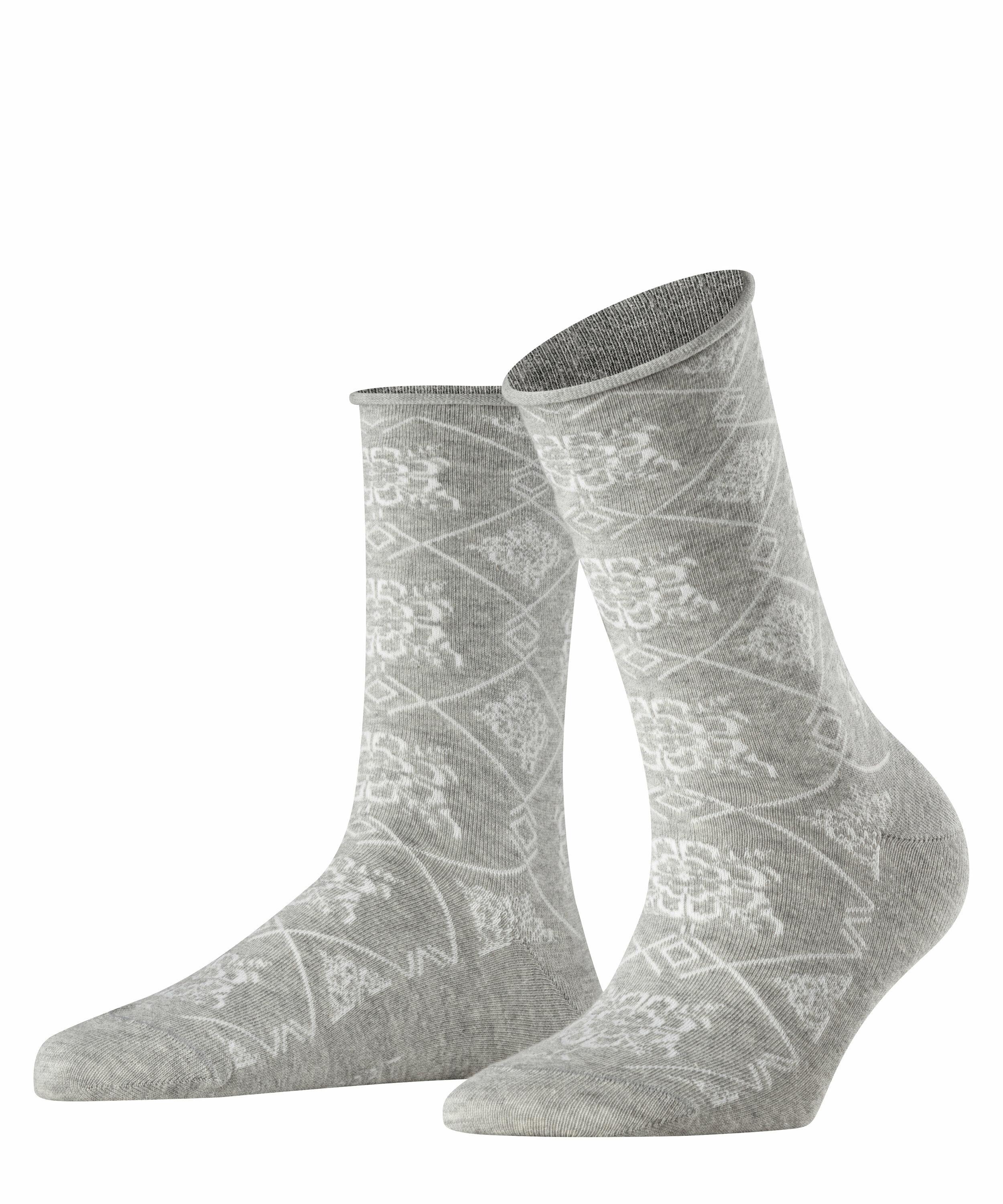 Die Socke mit zartem Blumenmuster setzt hübsche Akzente in alltäglichen Outfits. Der harmonisch abgesetzte Rollrand vollendet das feminine Design des Strumpfes.