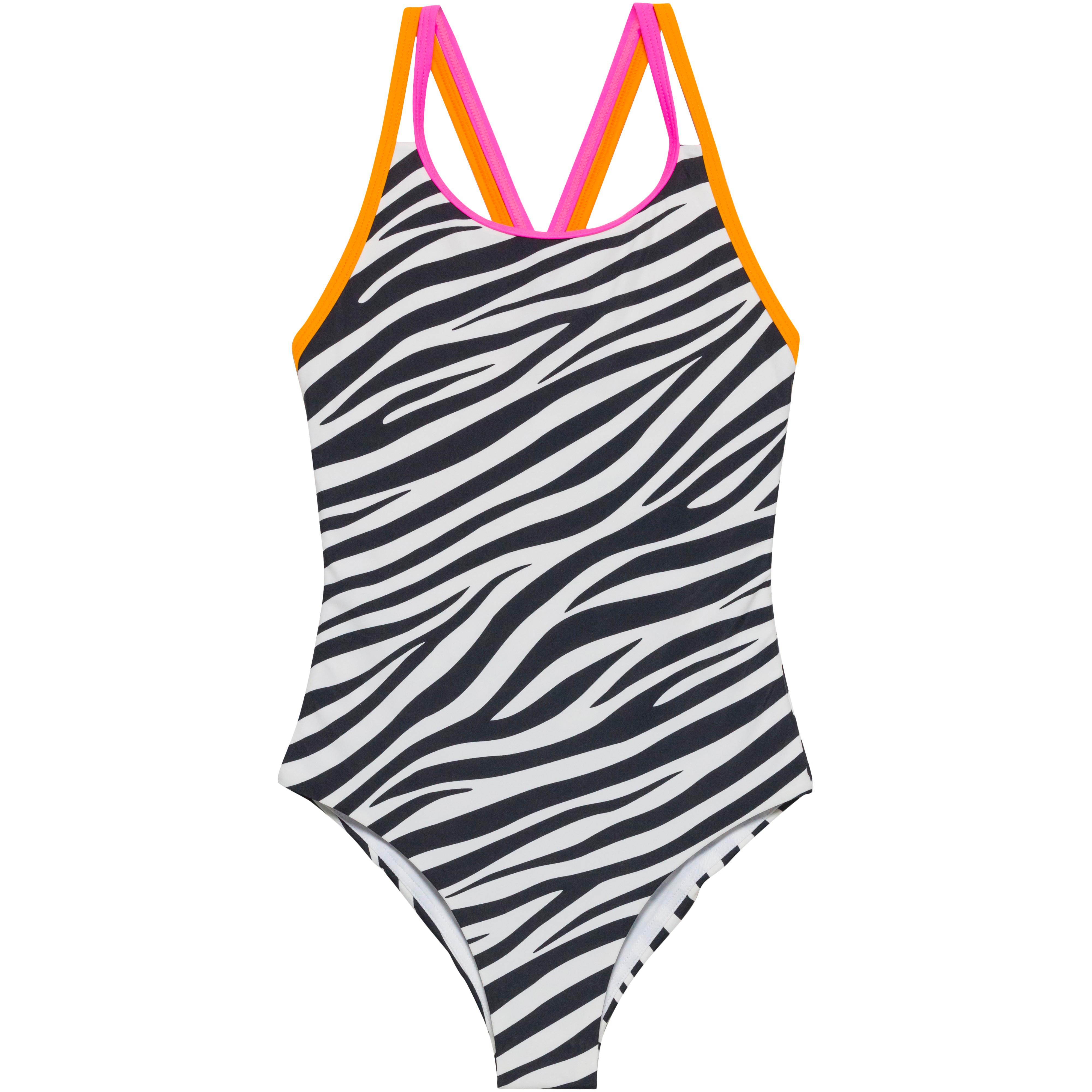 Stylisher Badeanzug für Kinder, mit Animal Print; farblich abgesetzte Doppelträger welche im Rücken zusammenlaufen; schnelltrocknende Funktion; Material 80% Polyamid, 20% Elastan.