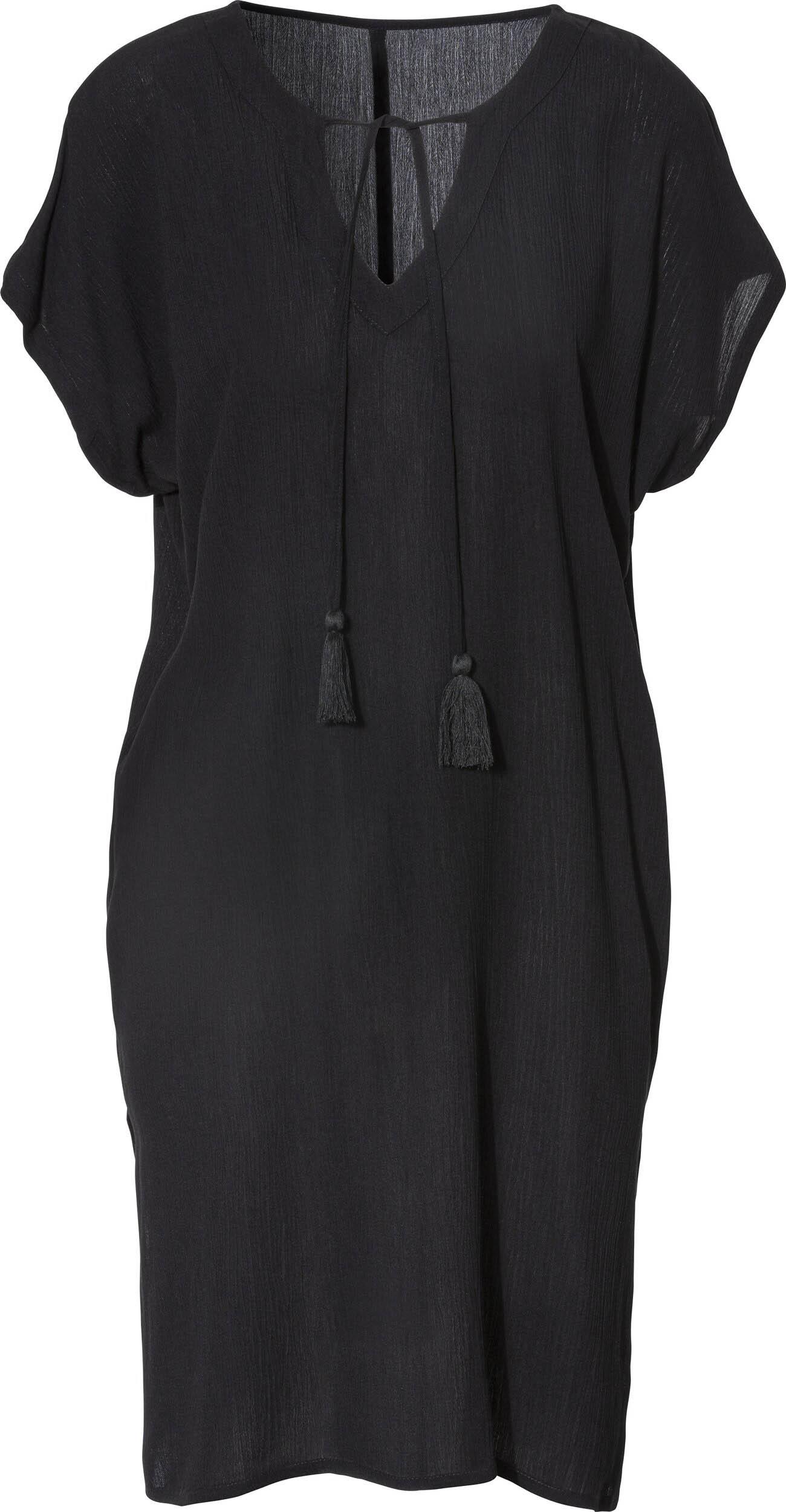 Strandkleid in Tunika-Passform aus sehr leichter und angenehm weicher Viskose; lange Bänder mit Quasten zum Schnüren am V-Ausschnitt; überschnittene Schultern mit kurzen Ärmeln; Material 100% Viskose.