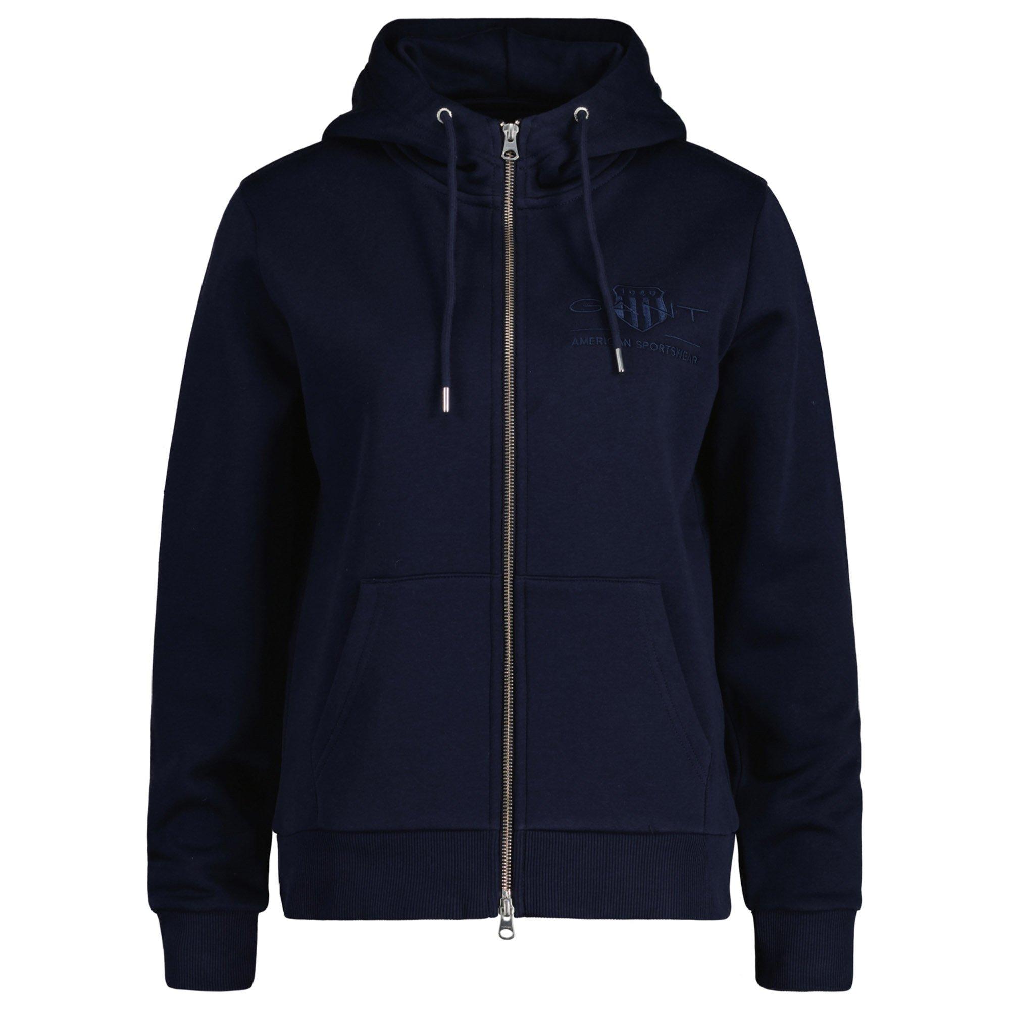 Stylische Kapuzen-Sweatjacke für Damen von der Marke GANT. Angenehm weicher Baumwoll-Mix, durchgehender Reißverschluss, tonige Logo-Stickerei, Känguru-Tasche.