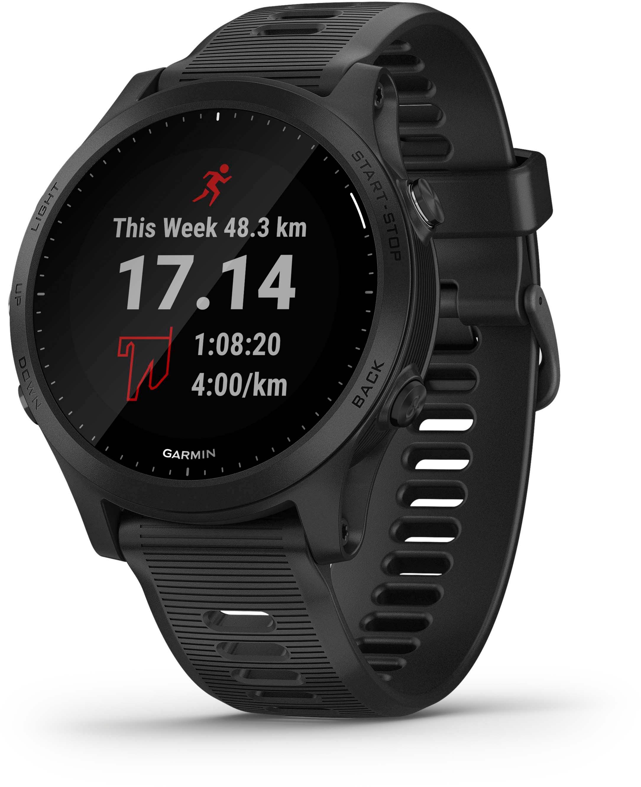 Garmin FORERUNNER 945 B. Sportuhr mit Herzfrequenzmessung am Handgelenk; mit GPS; Trainingsauswertung; zeichnet Distanz, Pace, Zeit, Herzfrequenz und mehr auf; verschiedene Aktivitätsmodi; mit Smart Notifications; automatische Uploads; auswechselbares Armband aus Silikon.