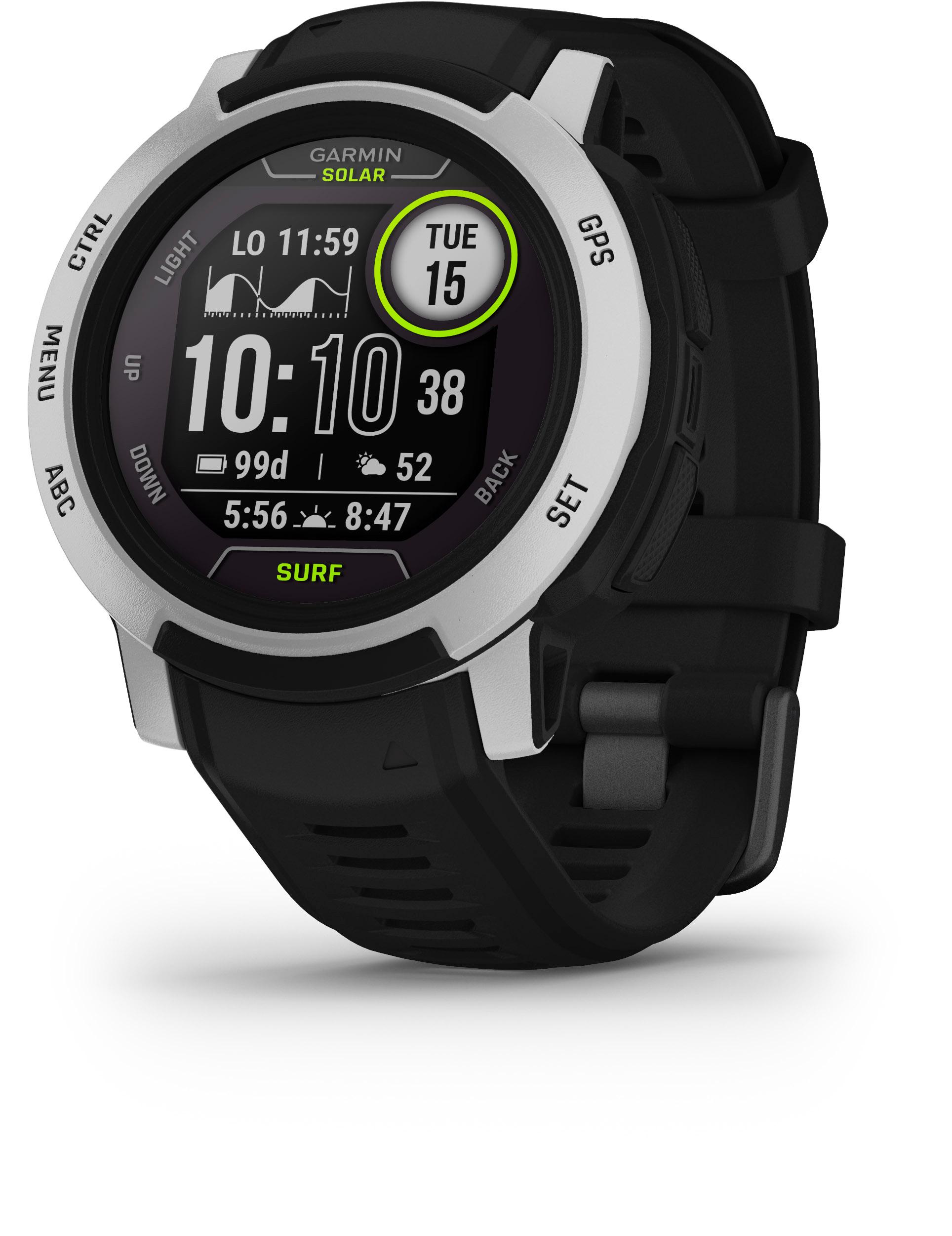 Smartwatch mit Solarladung und Surf-App; mit GPS, GLONASS und GALILEO-Navigation; Lünette und Gehäuse aus faserverstärktem Polymer; Display aus Power Glass ™; Silikonarmband; monochromes, bei Sonneneinstrahlung gut lesbares, transflektives MIP-Display; vorinstallierte Apps für Laufen, Radfahren, fast jede Standard- und Trend-Sportart sowie Outdoor-Aktivitäten; integrierte Surf-App zur Aufzeichnung von Wellen und Geschwindigkeiten; Gezeiteninformationen für jegliche Surf Spots direkt auf die Uhr; Herzfrequenzmessung am Handgelenk; Pulse Ox Sensor r2; Messung des Stresslevels; Body Battery ™; Smart Notifications; inReach® kompatibel; Kalender; Wecker, Stoppuhr; Schlaf-Tracking; Musikfunktionen; Telefon suchen; Smartphone-Kompatibilität; Schrittzähler; Kalorienverbrauch; diverse Trainings; Höhenmesser, Barometer, Kompass; US-Militärstandard 810 im Hinblick auf thermische Leistung, Stoßfestigkeit und Wasserdichtigkeit (10 ATM); Power Manager; im Smartwatch-Modus hält der Akku bis zu 54 Tage mit Solarladung, im Battery Saver Modus sogar noch länger; 16 GB interner Speicher; Maße: ca. 45 x 45 x 15,3 mm, für einen Handgelenkumfang von 132 bis 224 mm; Gewicht: ca. 53 g; inkl. Lade-/Datenkabel.